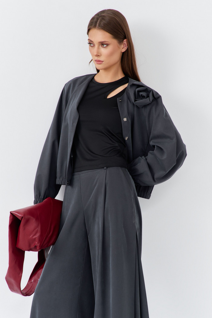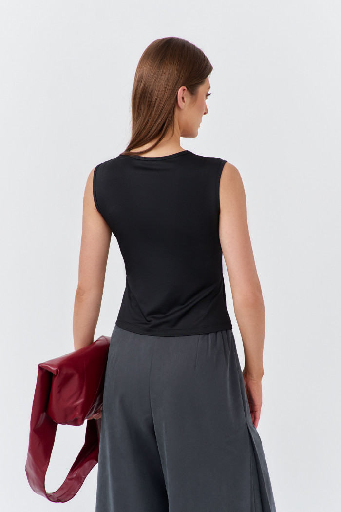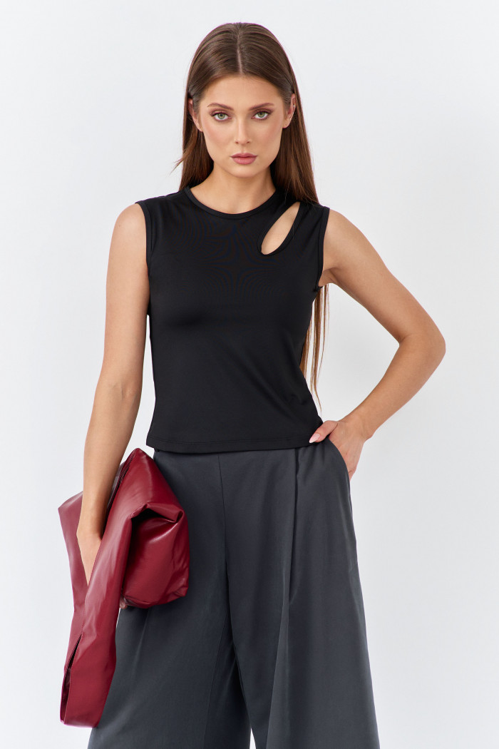 Джемпер выполнена из трикотажного полотна высокого качества, обладающего рядом положительных свойств: мягкость, эластичность и устойчивость к деформации. Модель полуприлегающего силуэта, без рукава. Деталь переда с фигурным вырезом от плеча в виде капельки. Горловина и проймы обработаны узкой бейкой. Длина изделия 47,5 см.