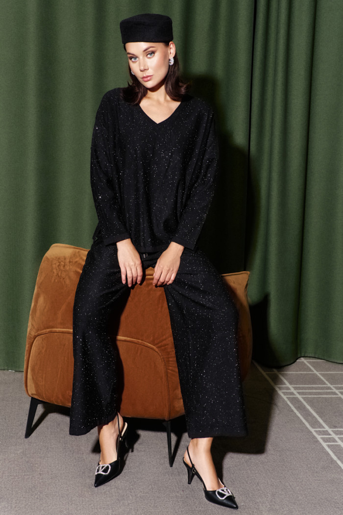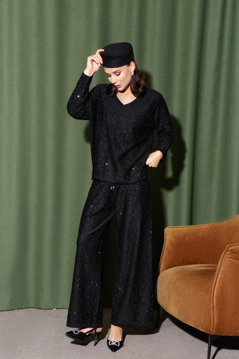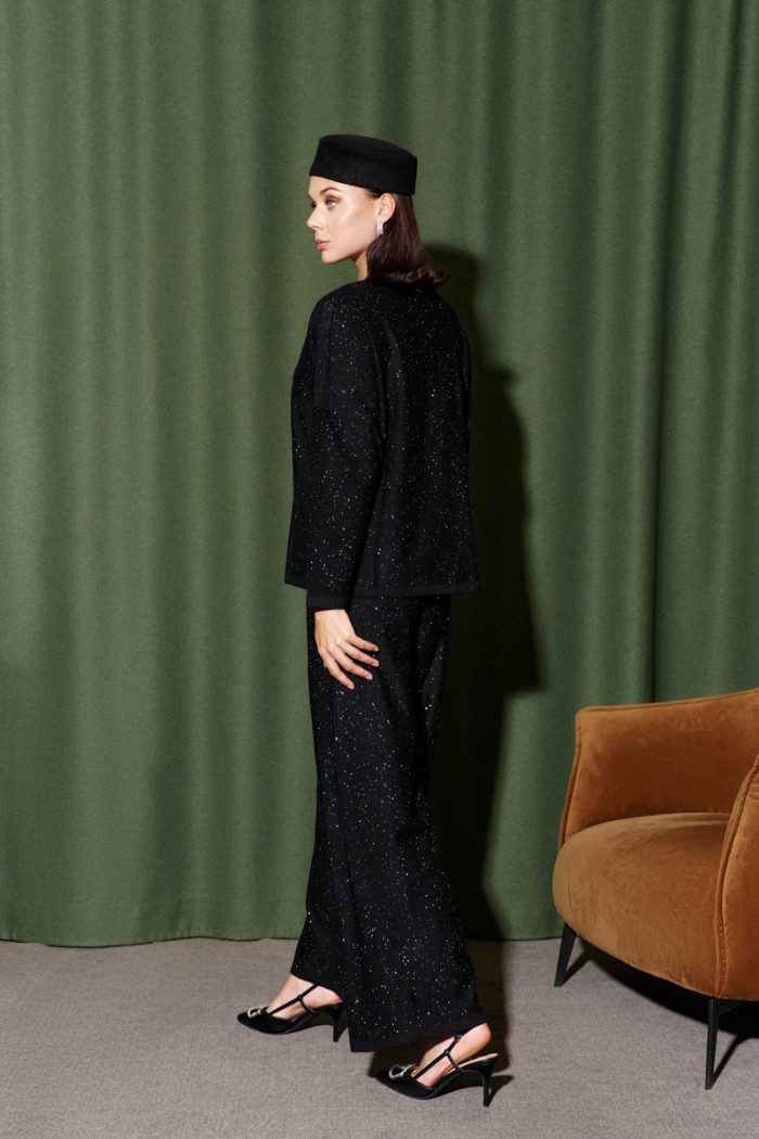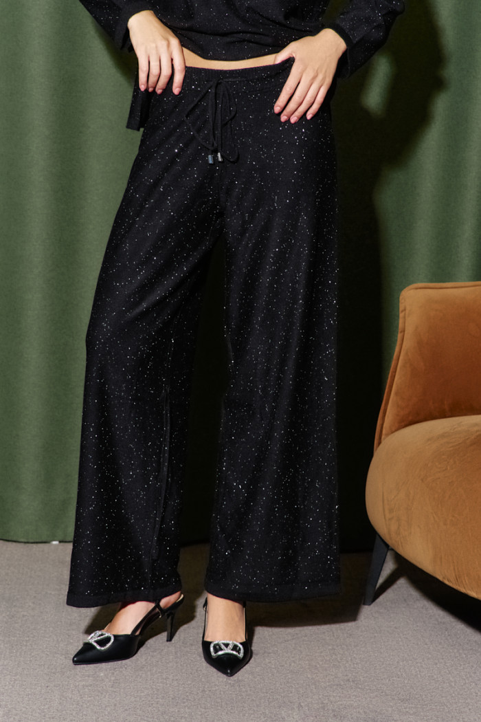 Свободные женские брюки из мягкого, приятного к телу трикотажа с паетками. Классическая средняя посадка подчеркивает фигуру и акцентирует внимание на талии. Широкий эластичный пояс-резинка на завязках. Трикотажные брюки с паетками станут базой на любой сезон. Длина изделия (с поясом) 97,5.