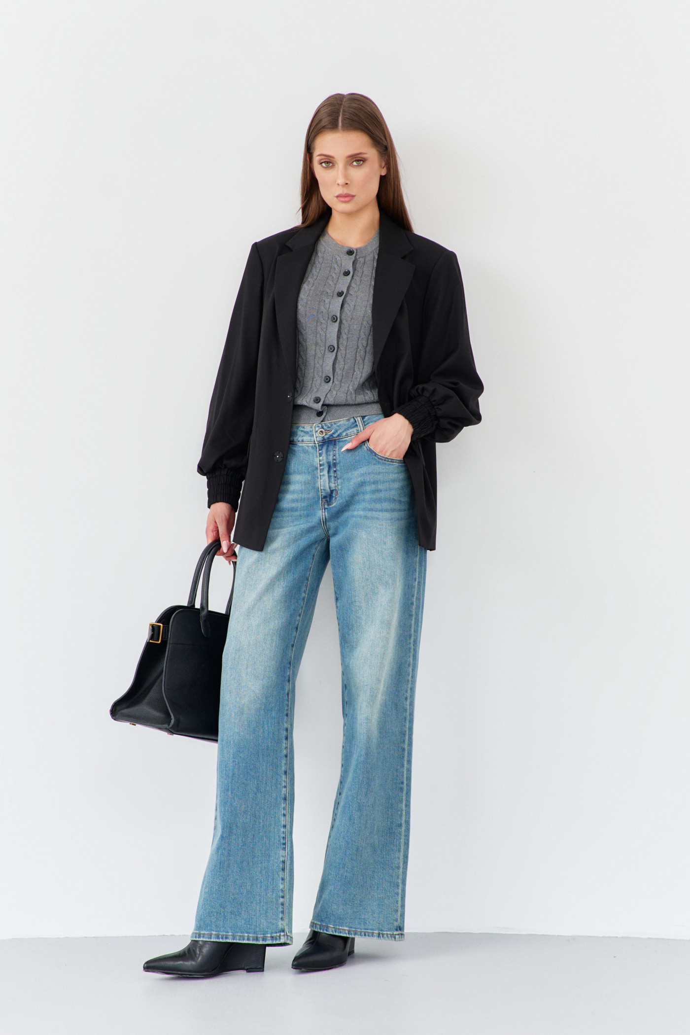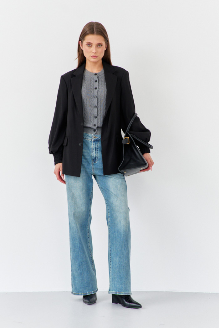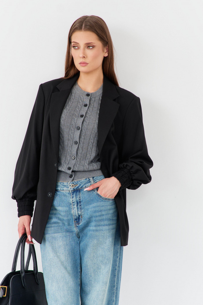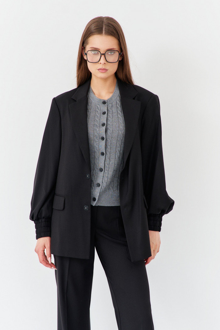 Женственный однобортный жакет на подкладке, выполнен из костюмного полотна. Модель полуприлегающего силуэта, с расширенной линией плеча с застежкой на две пришивные кнопки. Воротник отложной с лацканами классической формы. Для удобства в носке спереди расположены карманы "в рамку" с клапаном. Особый стиль изделию придаёт втачные длинные рукава, расширенные к низу с притачной манжетой на резинке. Длина изделия 72 см; длина рукава 62 см.