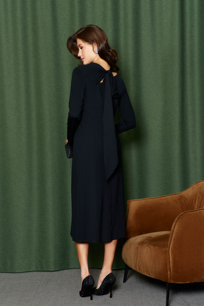 Платье выполнено из трикотажного полотна. Модель полуприлегающего силуэта. V-образная горловина, переходящая красивый декоративный узел. Для удобства вноске по горловине спинке завязки, завязывающиеся в бант. Рукава длинны втачные с разрезом понизу в шве. Длина изделия 132 см, длина рукава 62 см.