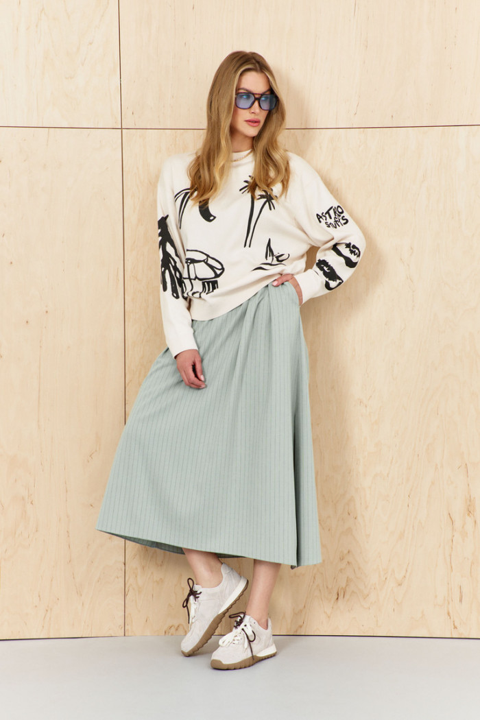 Свободный женский вязаный джемпер с актуальным принтом. Базовая модель со спущенной линией плеча. Круглый вырез горловины. Рукава и низ изделия оформлен манжетой в виде резинки. Длина изделия до бедра. Джемпер можно стилизовать с надетой под него рубашкой или же как самостоятельный элемент образа. Длина по спинке 68 см; длина рукава (от горловины) 79,5 см.