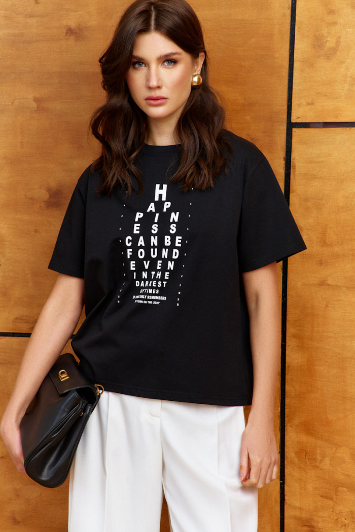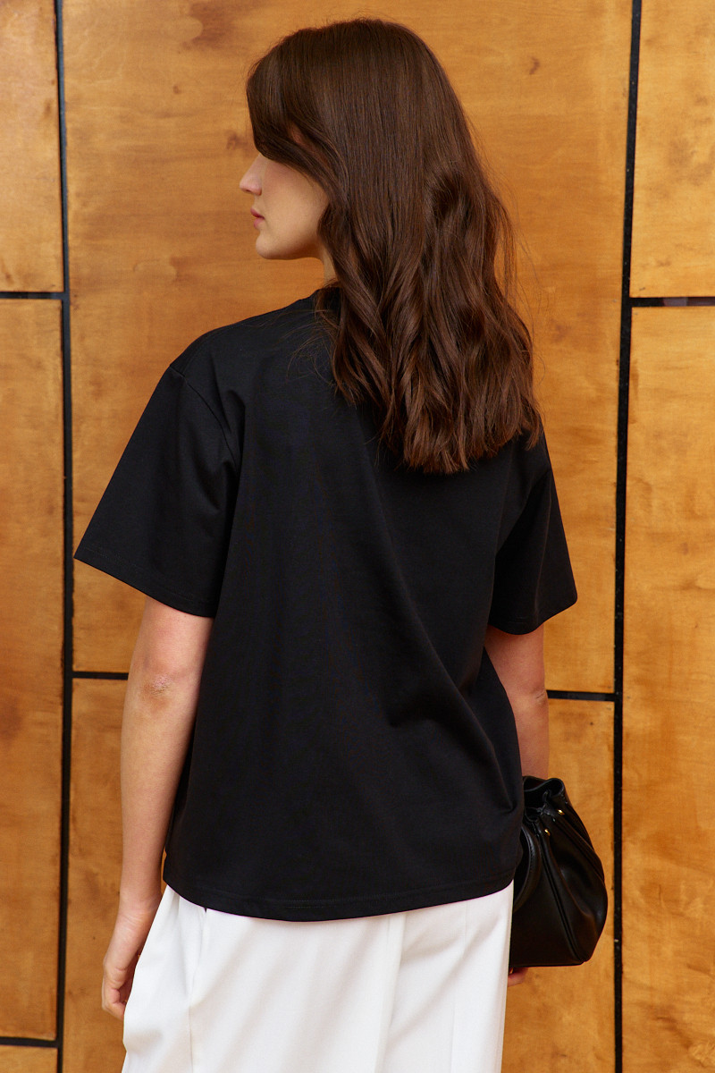 Джемпер выполнен из хлопкового трикотажного полотна высокого качества, обладающего рядом положительных свойств: мягкость, эластичность и устойчивость к деформации. Модель свободного кроя, со спущенной линией плеча и коротким рукавом. Горловина обработана узкой бейкой, а по спинке усилена тесьмой с целью предотвращения ее деформации. Длина по спинке 66 см; длина рукава (от горловины) 39,5 см.