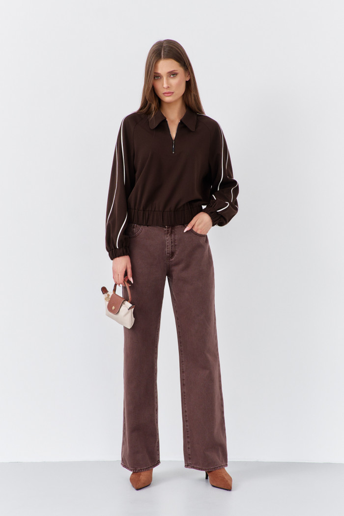 Брюки в стиле smart casual выполнены из хлопкового джинсового полотна. Модель с комфортной высокой посадкой на притачном поясе со шлёвками и застёгивающемся на декоративную пуговицу. Спереди предусмотрены карманы с отрезным бочком и застёжка на "молнию", сзади накладные карманы. Модель декорирована наличием отделочных строчек. Длина изделия по боковому шву (с поясом) 108 см.