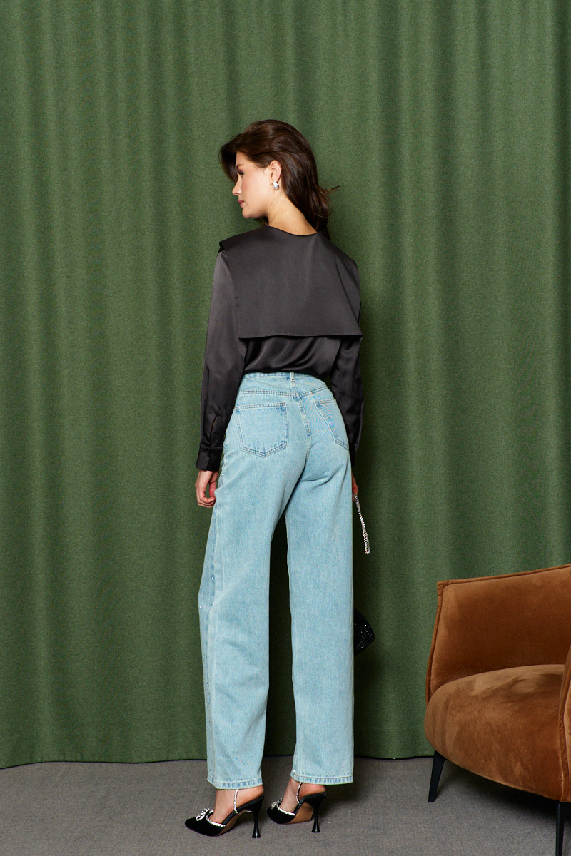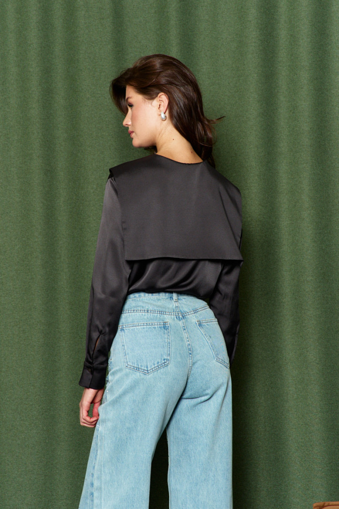 Блузка в стиле city chic выполнена из сатинового полотна с лёгким блеском. Модель прямого силуэта со спущенной линией плеча. V-образный вырез горловины спереди и втачным плосколежащим воротником в "морском" стиле. Спереди расположена застежка на петли и декоративные пуговицы. Рукава втачные длинные со складками вдоль застёгивающейся манжеты. Длина изделия 62, 5 см, длина рукава 59 см.