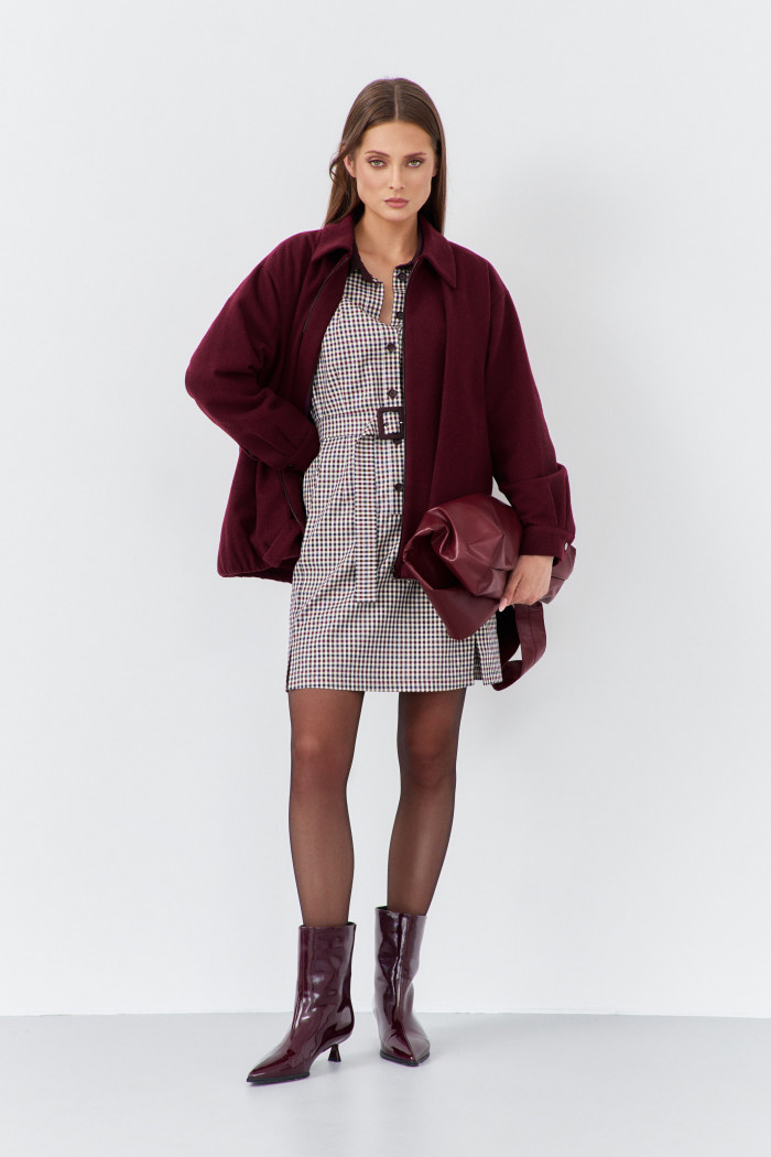 Стильный и практичный жакет на подкладке является отличным выбором для создания разнообразных модных образов. Изделие выполнено из пальтового полотна. Модель А-образного силуэта со сборкой по низу и поясом из основного полотна на металлической пряжке. Воротник стояче-отложной на стойке, центральная застёжка на металлическую тесьму "молнию". Для удобства в носке спереди предусмотрены прорезные карманы с широкой листочкой. Спущенная линия плеча, рукава длинные со складками вдоль застёгивающейся манжеты на пробивную кнопку. Длина изделия 69 см; длина рукава (от горловины) 73 см.