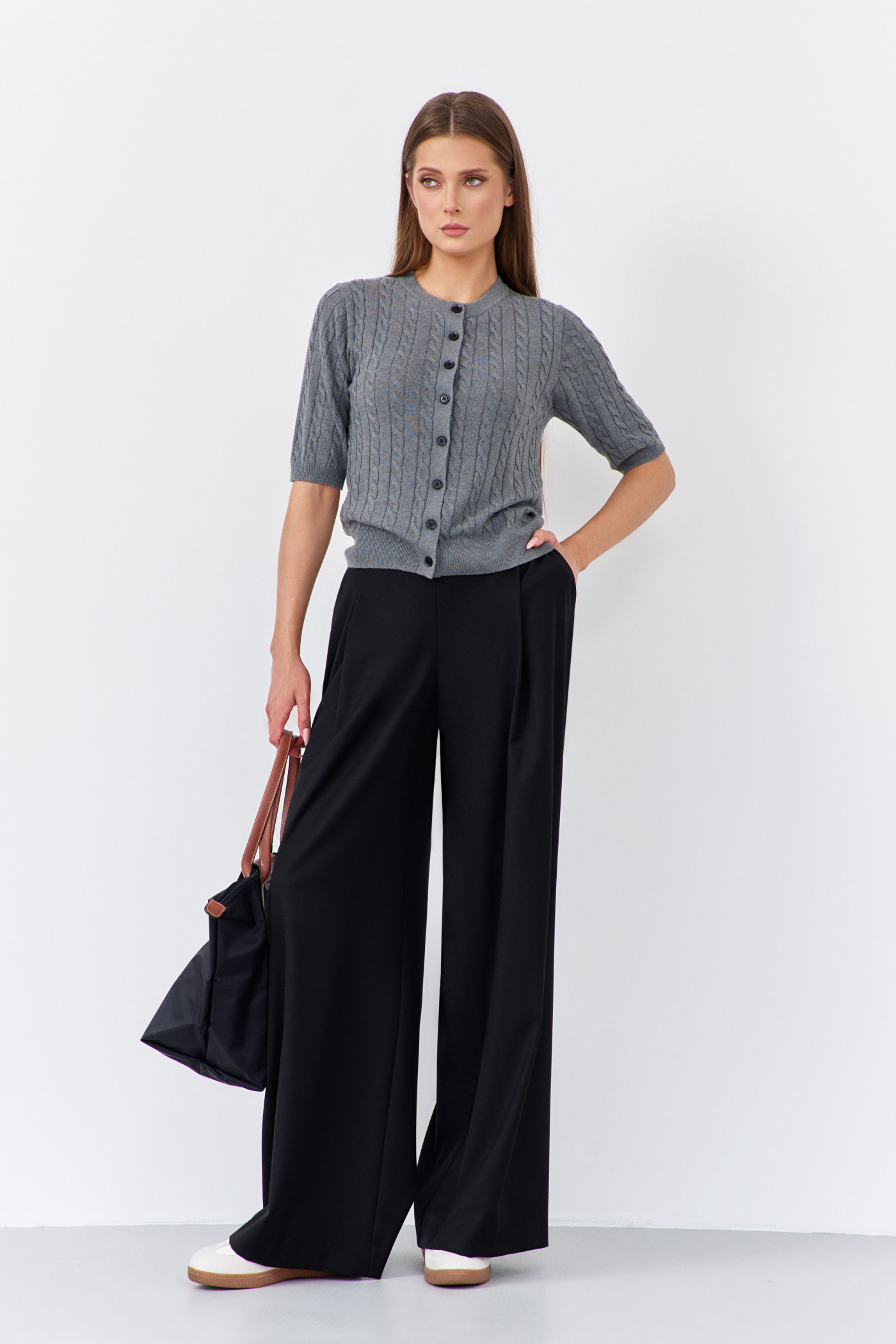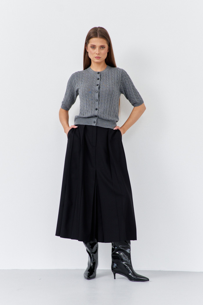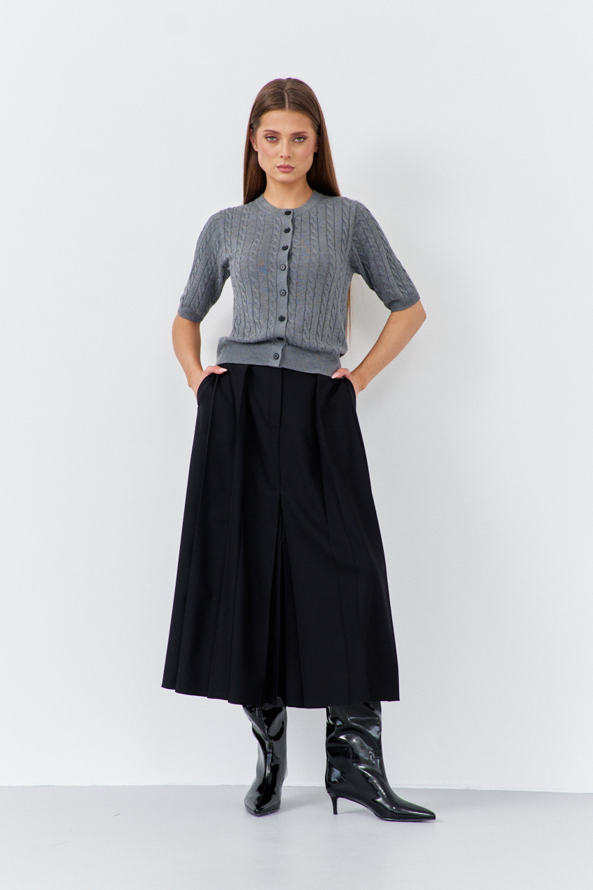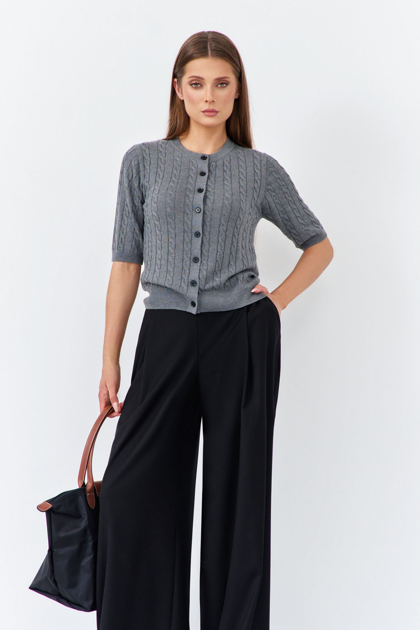 Вязаный кардиган с универсальным дизайном, узором "косы", сочетается практически со всем. Модель с планкой спереди на декоративных пуговицах. О-образный вырез горловины визуально удлинит шею. Короткий рукав и низ изделия оформлены манжетами в виде резинки. Этот стильный женский кардиган в стиле old money станет отличным дополнением вашего гардероба на осень и зиму. Длина изделия 51 см; длина рукава 31 см.