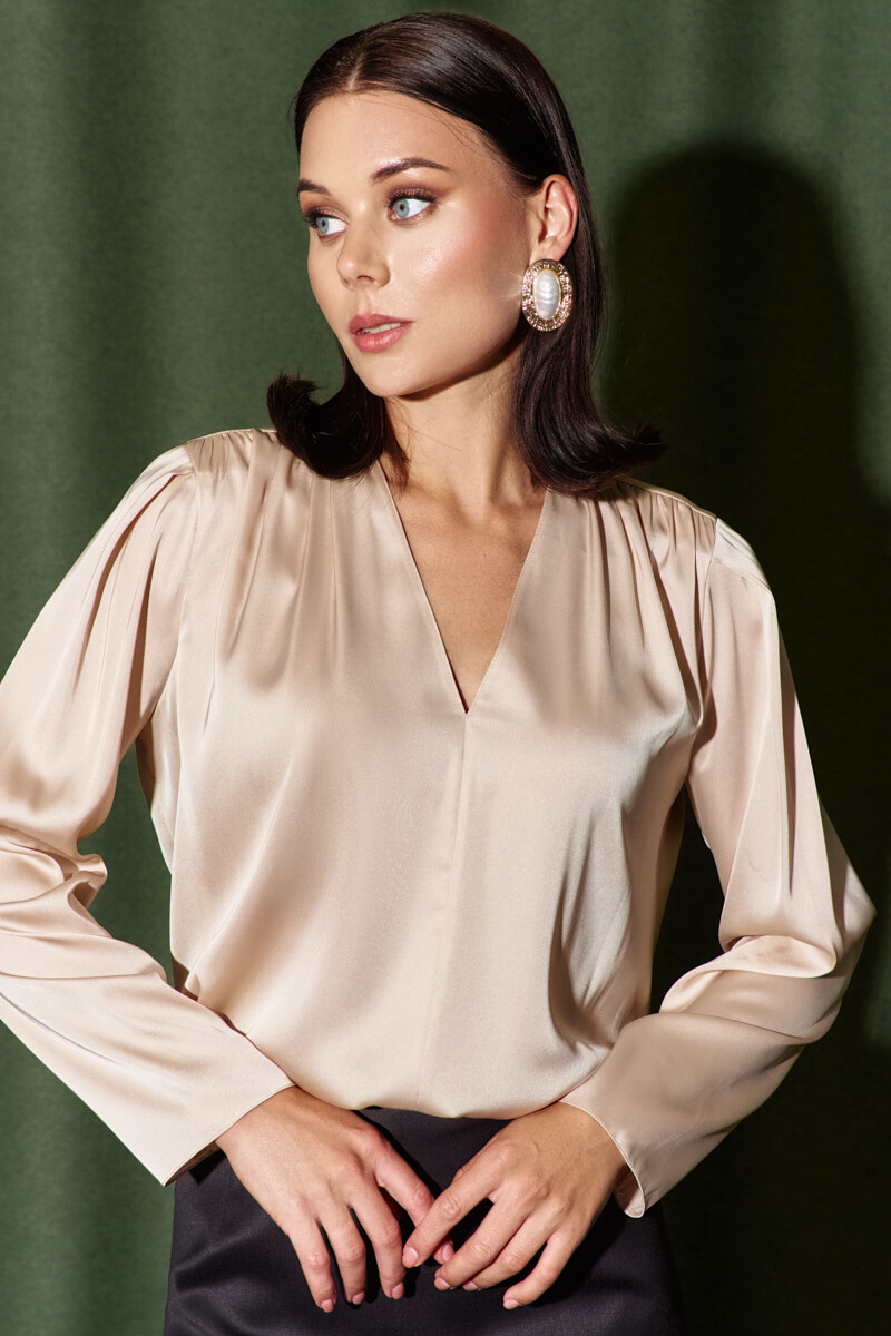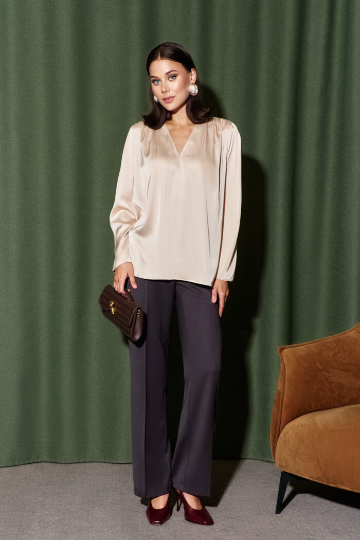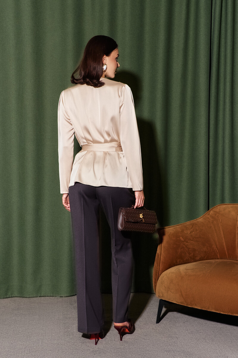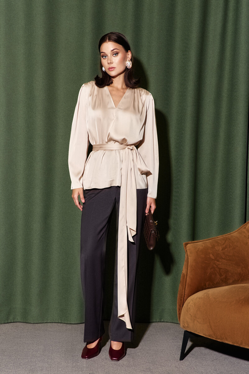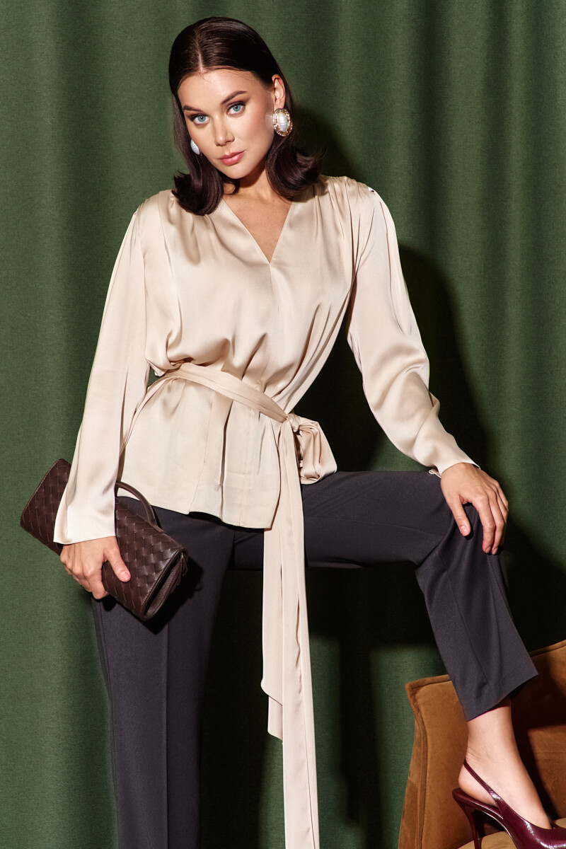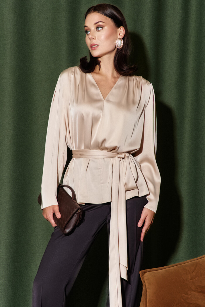 Блузка в стиле city chic выполнена из сатинового полотна с благородным блеском. Модель свободного силуэта. V-образная горловина на запах. По линии плеча переда сборка. Рукава длинные втачные с "бантовой" складкой по окату. Модель дополняется широким поясом из основного полотна. Длина изделия 61 см; длина рукава 65 см.