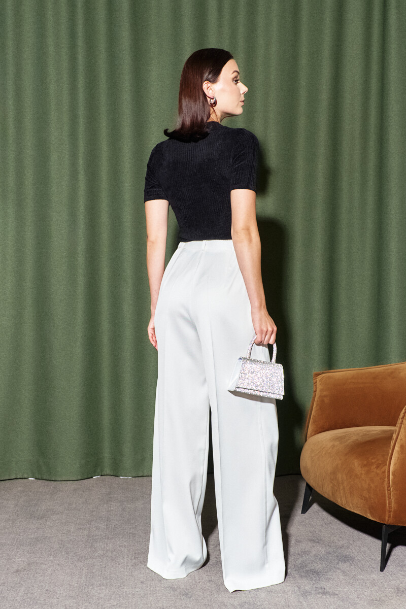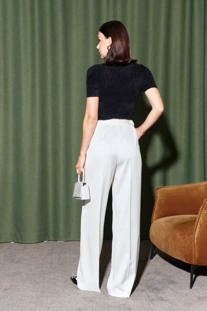 Классические свободные брюки в стиле city chic выполнены из костюмного полотна. Модель с комфортной высокой посадкой, на притачном поясе со шлевками и эластичной лентой внутри по спинке, застегивающимся на потайной брючный крючок. Спереди предусмотрен косой карман в правой части переда и застёжка на тесьму «молнию». Особым декоративным элементом является разрез на части переда, из которого видна отделочная деталь. Длина изделия по боковому шву (с поясом) 113 см.
