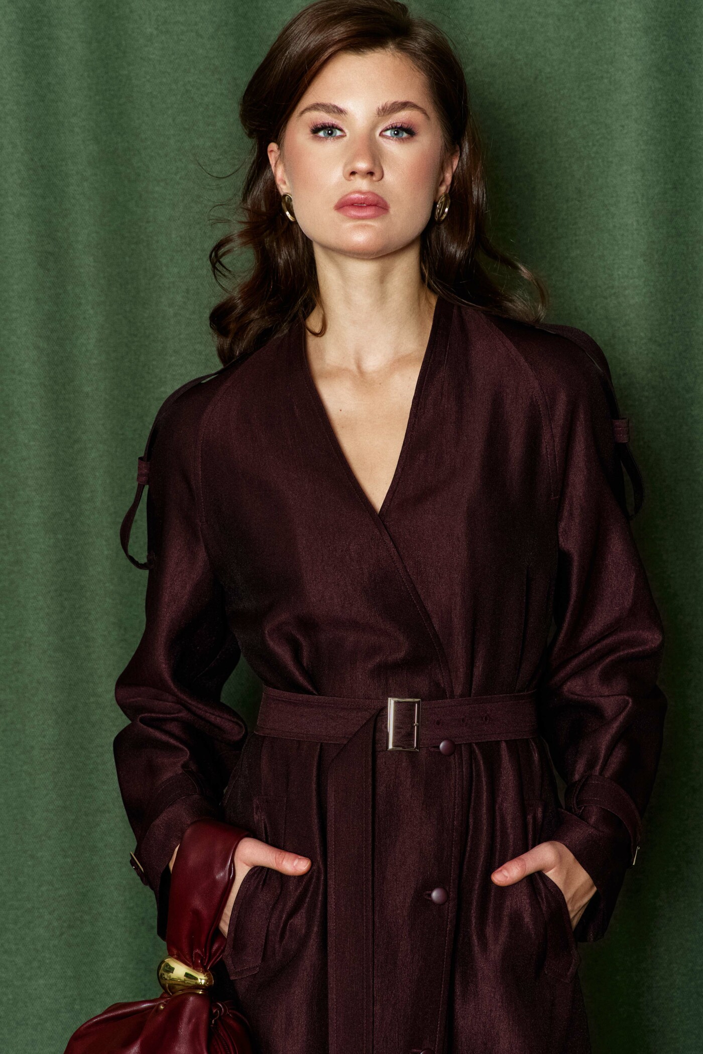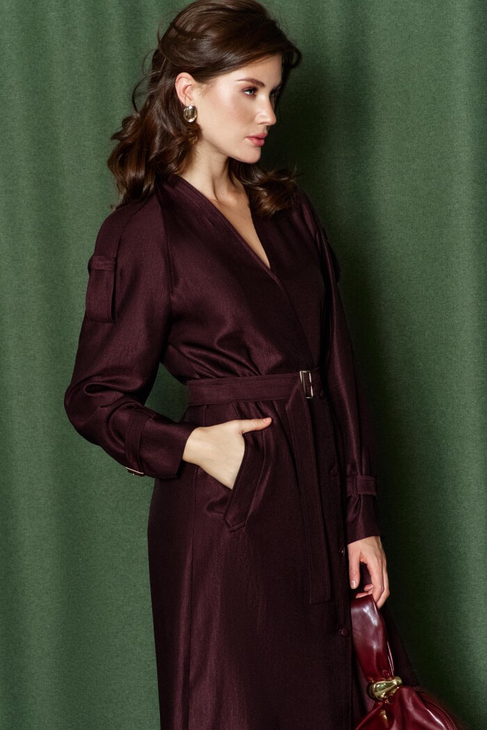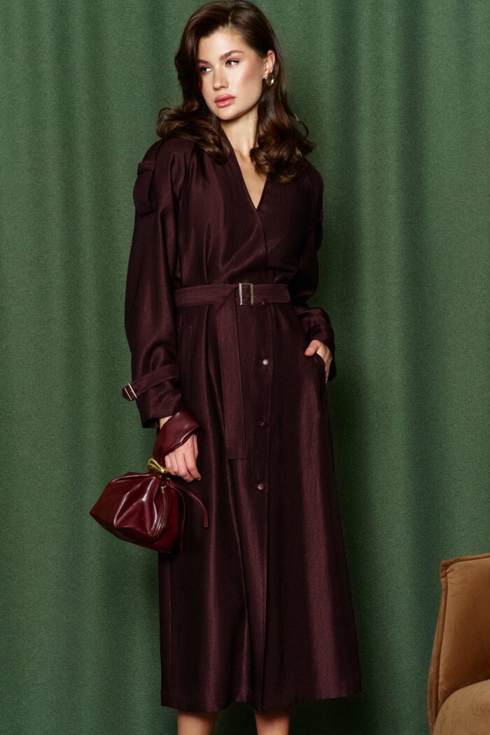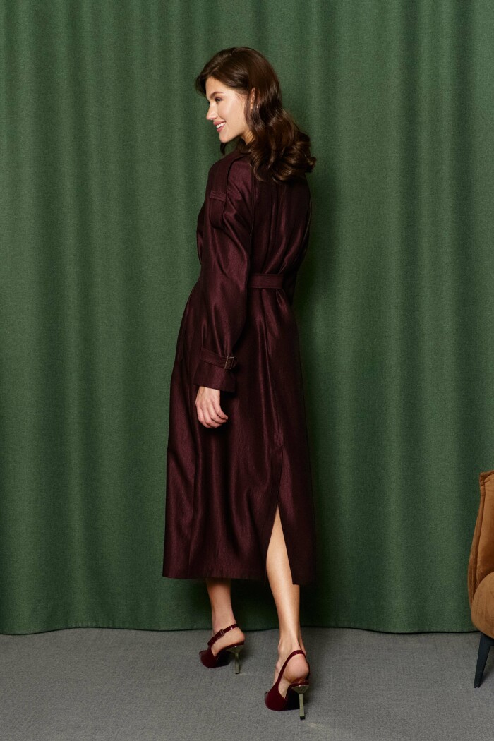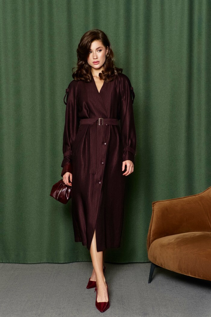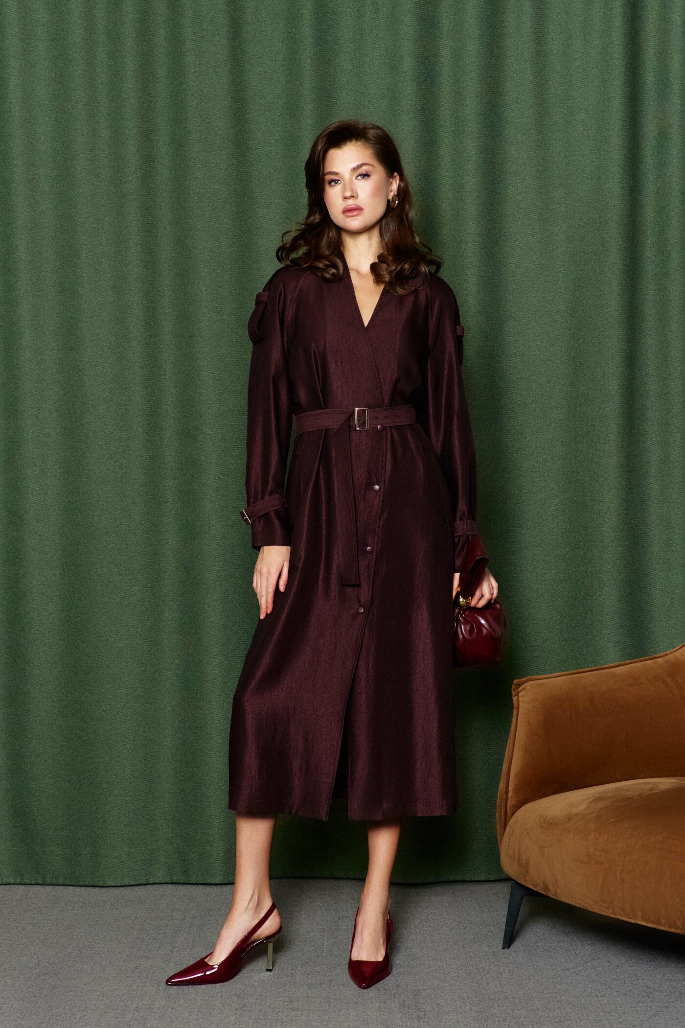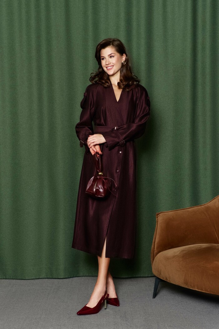 Платье в стиле smart casual выполнено из костюмно-плательного полотна с благородным блеском. Платье прямого силуэта, немного расширенное к низу, с двубортной застежкой на петли и декоративными пуговицами. V-образная горловина, переходящая в стойку по спинке. На плечевых швах настрочены погоны. Для удобства в носке спереди расположены прорезные карманы с фигурной широкой листочкой. В среднем шве спинки предусмотрена шлица. Рукава длинные реглан со шлевками по низу для съемных пат и застегивающиеся на пришивную металлическую пряжку. Особый вид изделию придают отделочные строчки. Модель комплектуется поясом из основного полотна на пришивную металлическую пряжку. Длина изделия 125 см; длина рукава (от горловины) 77 см.