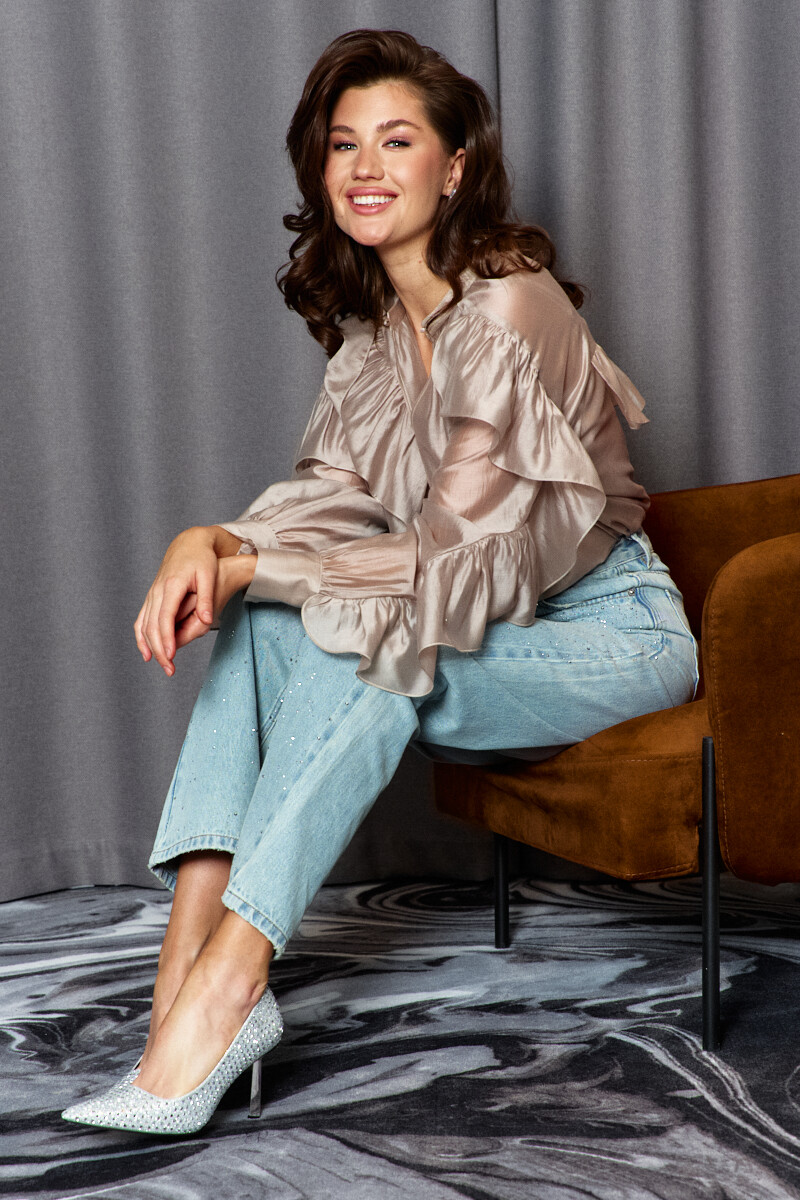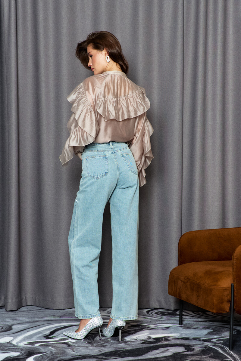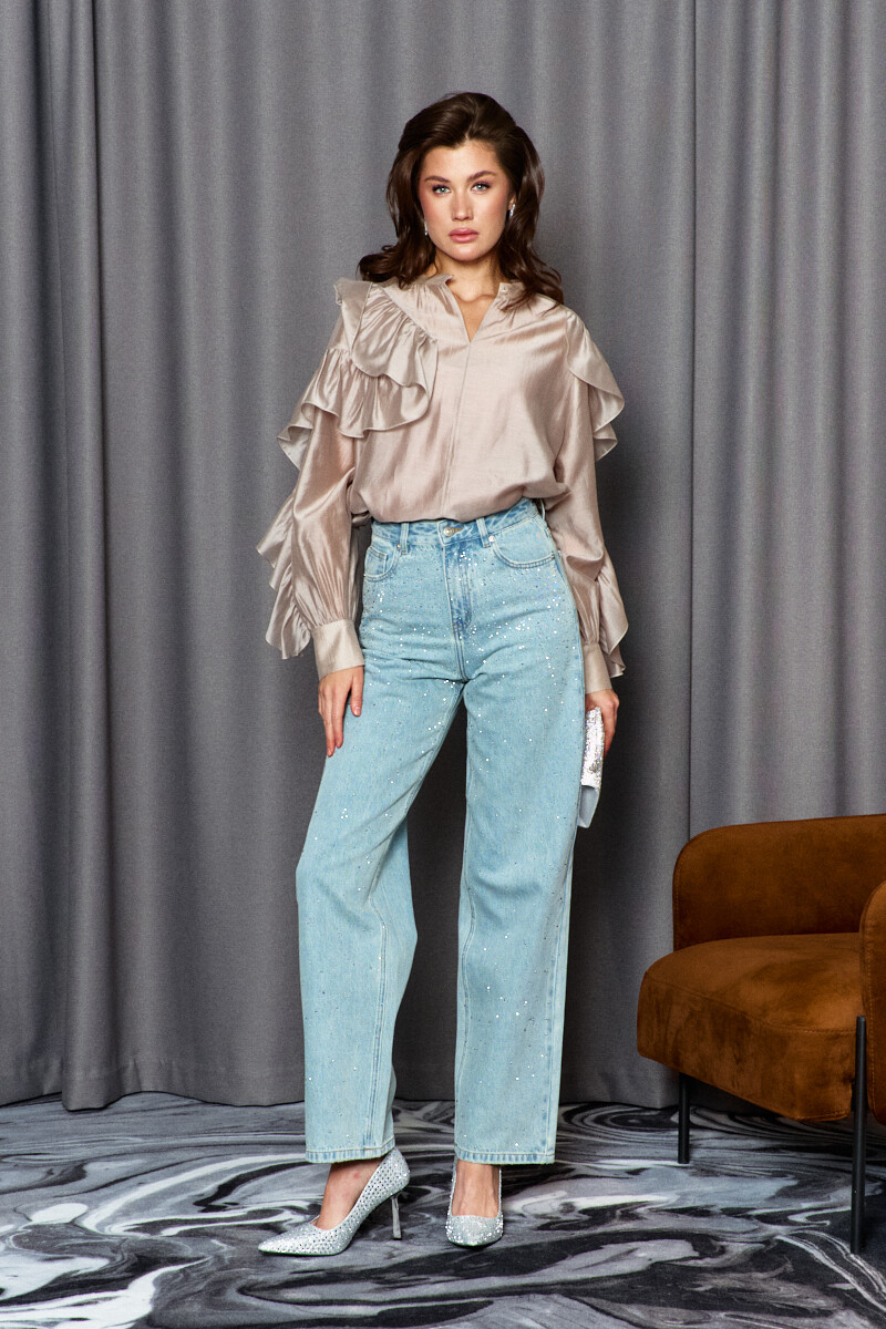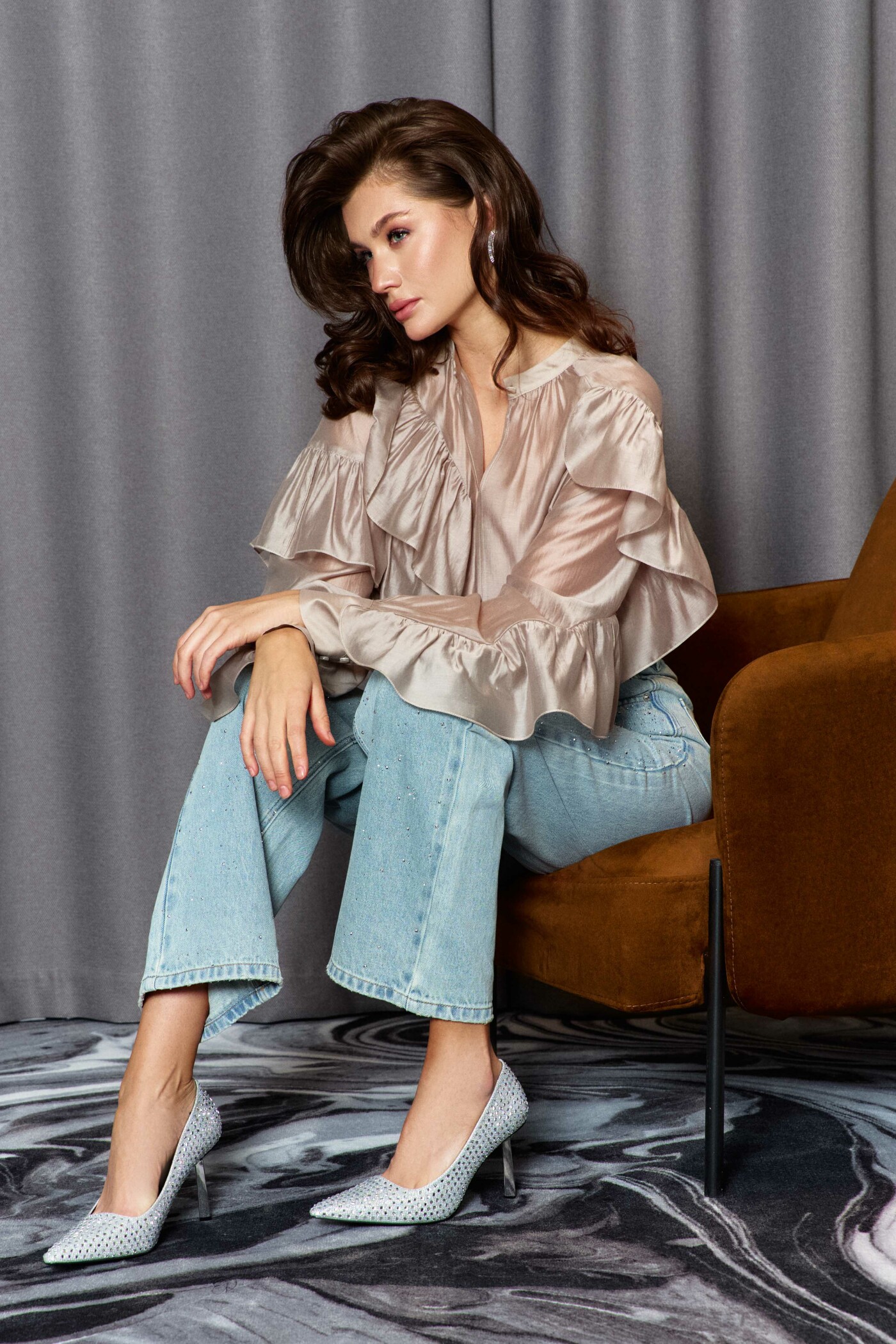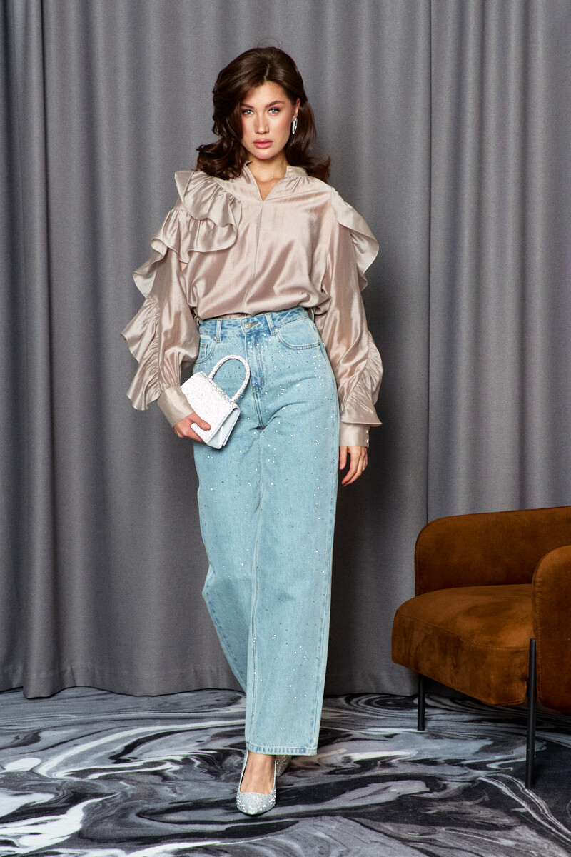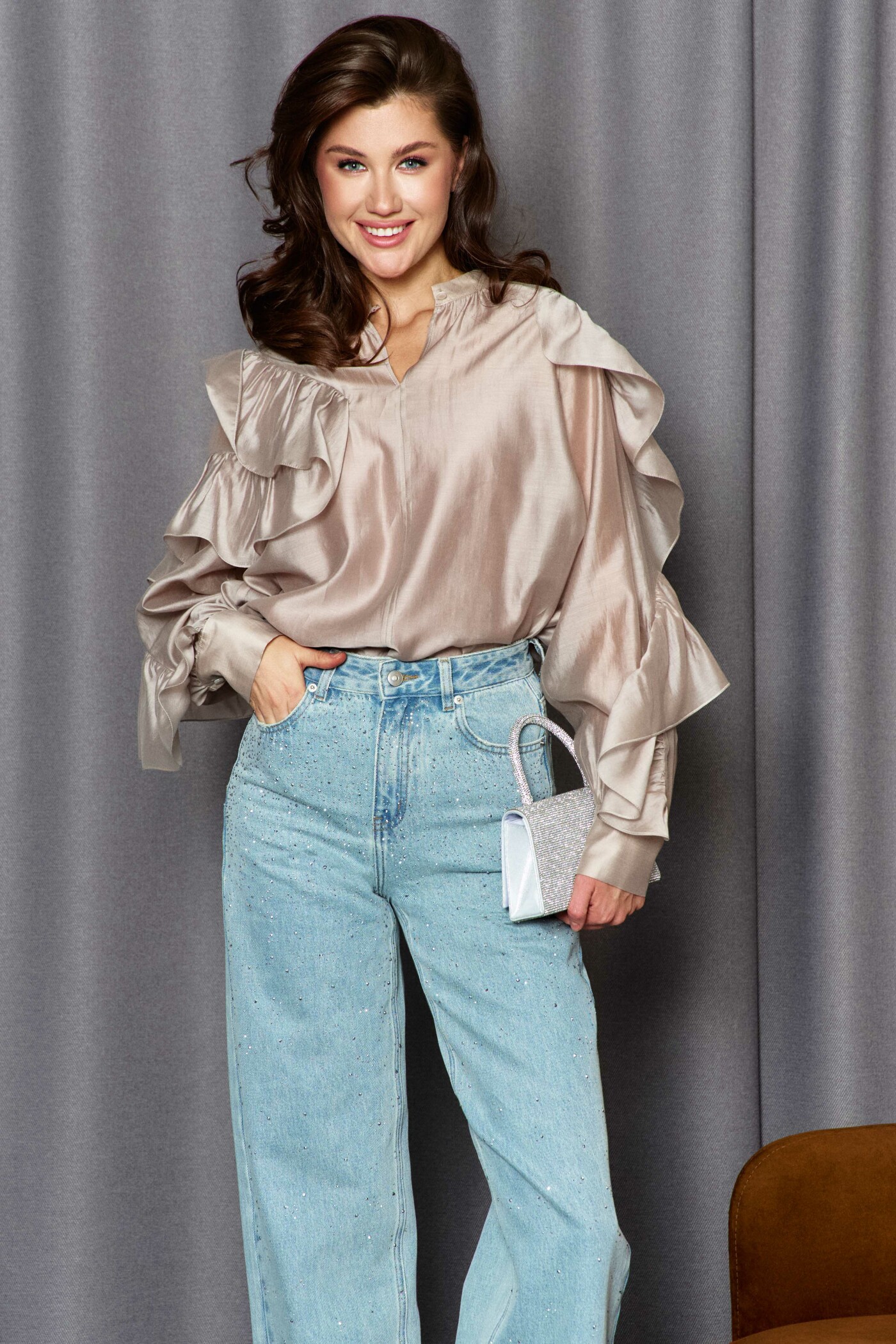 Блузка в стиле city chic выполнена из платьево-блузочного полотна. Модель расширенного силуэта. Горловина – стойка. Перед блузки со средним швом, в котором от горловины выполнен вертикальный разрез. На левом рукаве блузки выполнен фигурный рельеф от плеча до низа, в который вставлена присборенная рюша. Правая часть переда и правый рукав блузки также с фигурными рельефами, в которые вставляется присборенная рюша, переходящая в подрез на спинке блузки. Рукава — длинные реглан со сборкой вдоль застегивающейся манжеты. Модель комплектуется топом из вискозного полотна на регулируемых по длине бретелях. Длина изделия 63 см, длина рукава(от горловины) 77 см.