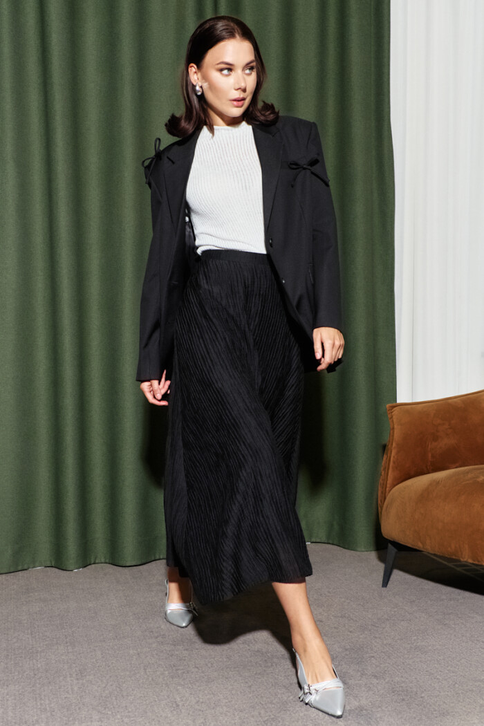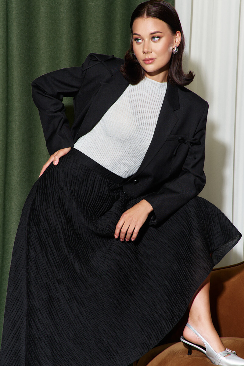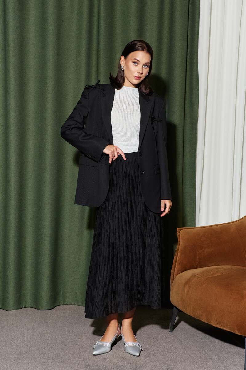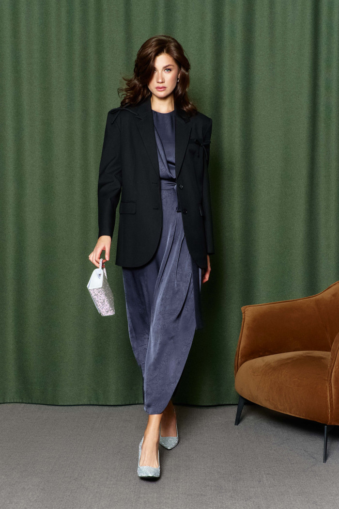Однобортный классический жакет на подкладке выполнен из костюмного полотна. Модель прямого силуэта с лацканами пиджачного типа и длинными рукавами со шлицей. Для удобства в носке спереди предусмотрены прорезные карманы «в рамку». Левая часть переда дополнена декоративной нагрудной листочкой. В среднем шве спинки — шлица. Особый вид изделию придают бантики из основного полотна. Длина изделия 75 см; длина рукава 62 см.