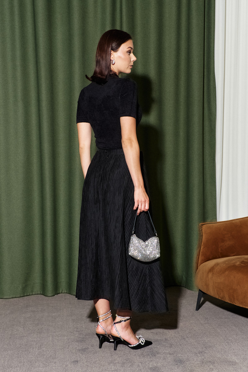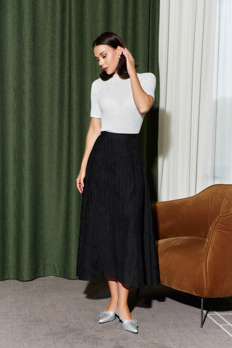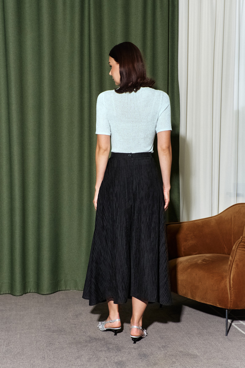 Юбка на подкладке, выполнена из крэш полотна, с эффектом «non iron» (не требующая утюжки). Модель А-образного силуэта, с комфортной высокой посадкой по линии талии, с притачным поясом на петлю и декоративную пуговицу. В среднем шве спинки потайная тесьма "молния". Длина по боковому шву (с поясом) 86 см.