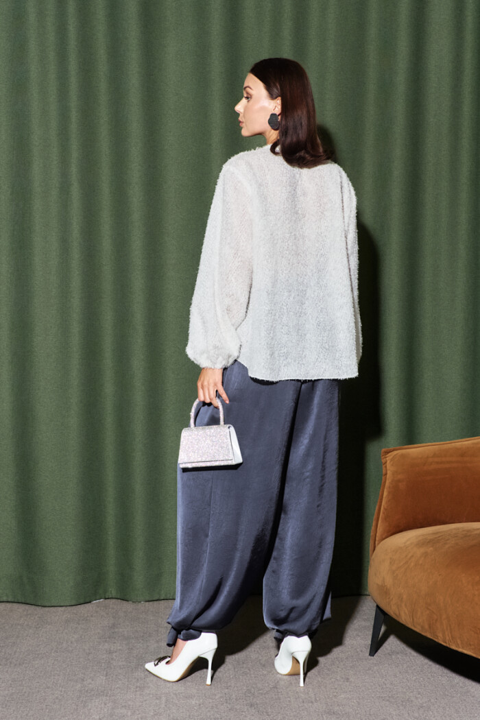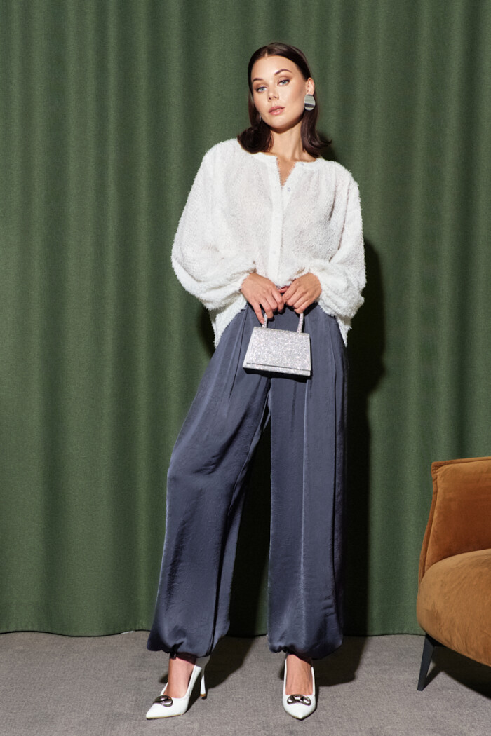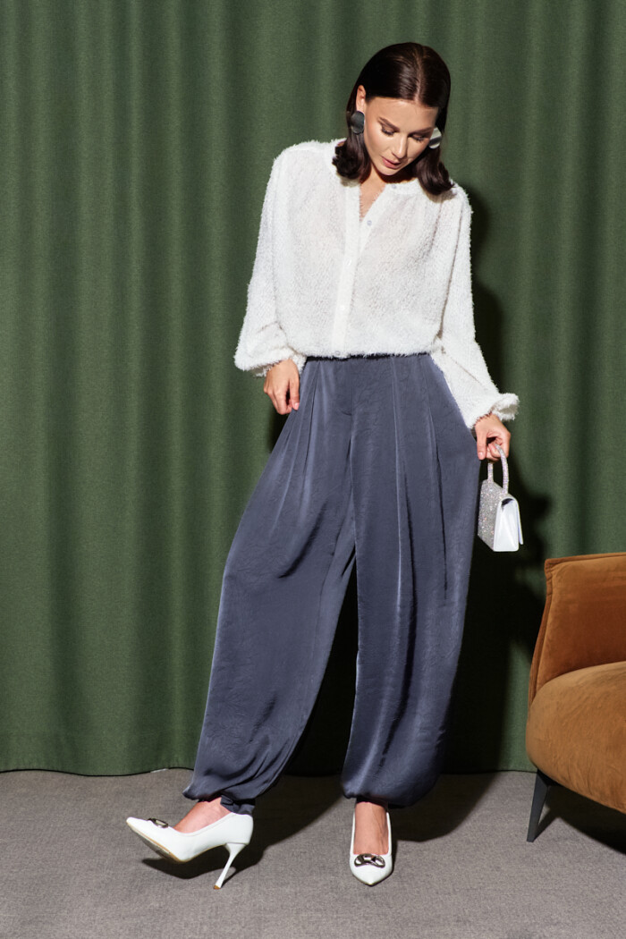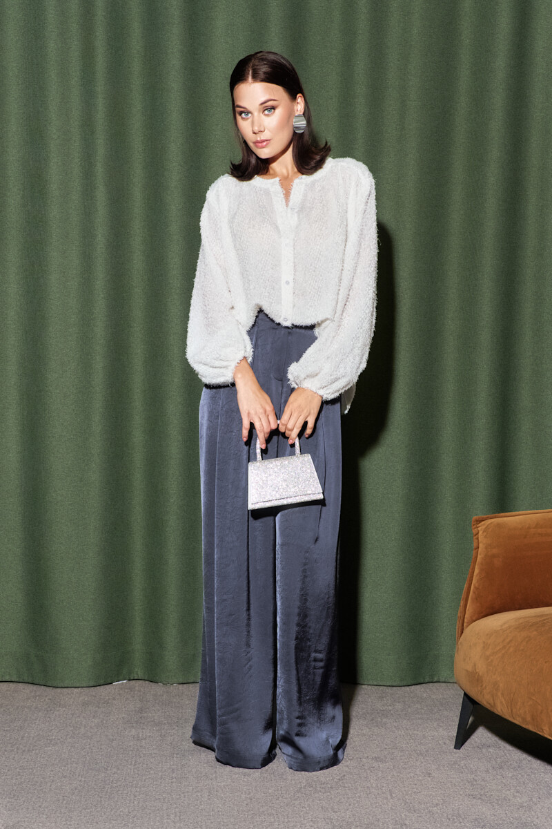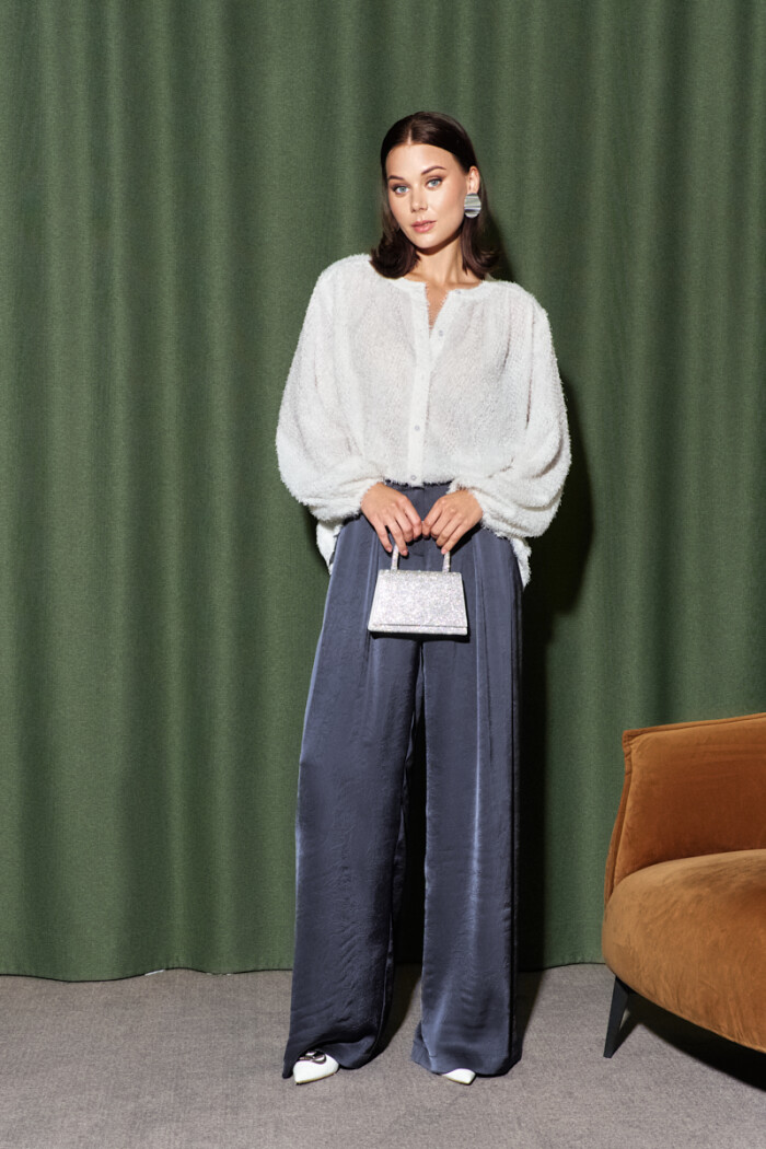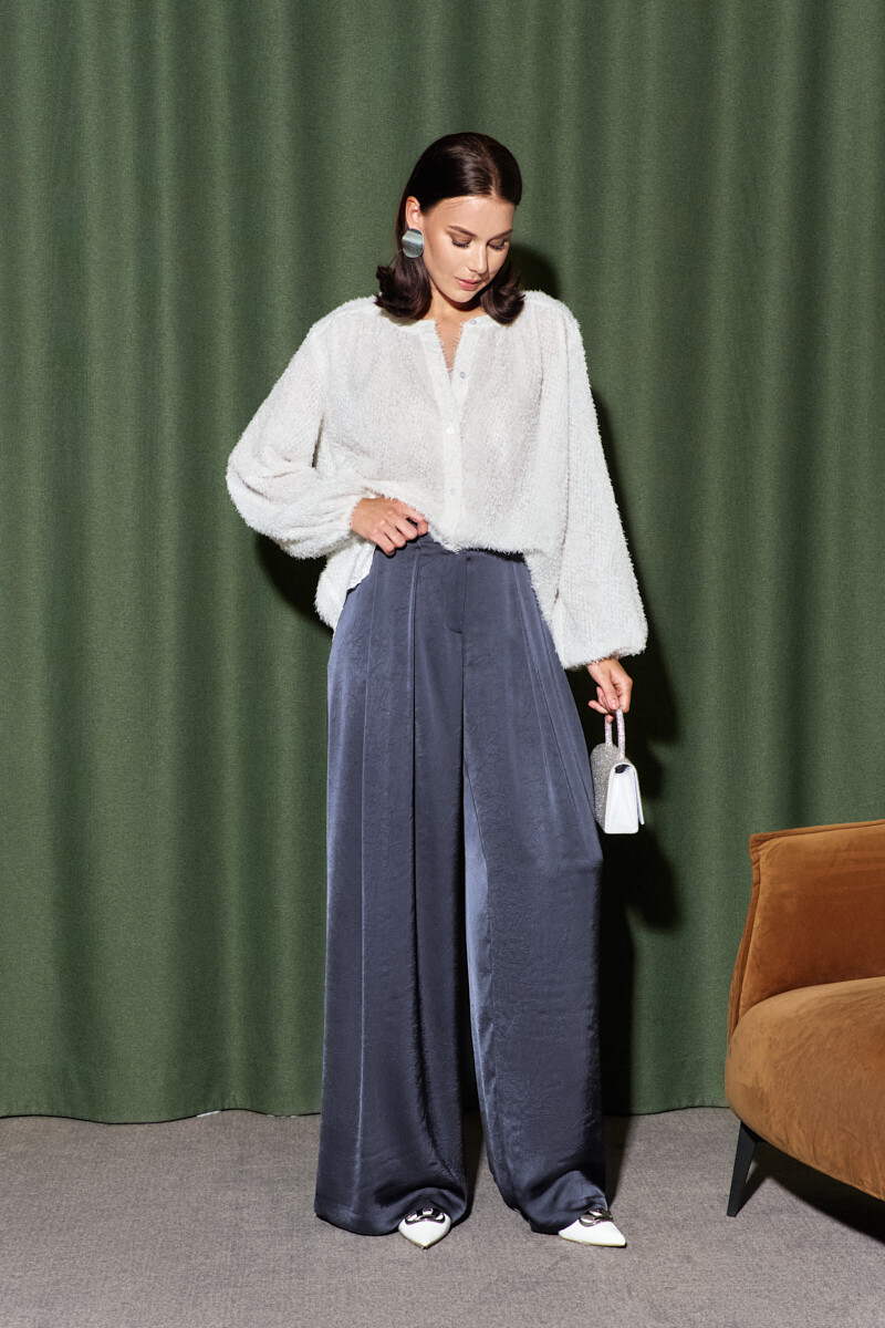 Классические свободные брюки выполнены из струящегося сатинового полотна с благородным блеском. Модель с комфортной высокой посадкой; на притачном поясе со шлевками и эластичной лентой внутри по спинке; застёгивающимся на потайной брючный крючок. Спереди предусмотрены косые карманы и застёжка на тесьму "молнию". Особым декоративным элементом являются спереди шлевки в виде глубокой складки. Длина изделия по боковому шву (с поясом) 115 см.