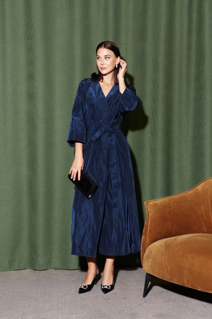 Платье в стиле smart casual выполнено из плащевой ткани. Модель полуприлегающего силуэта со спущенной линией плеча. На передней части застрочены глубокие складки, из которых выходит пояс из основной ткани, завязывающийся на бант. По спинке широкая эластичная лента. V-образная горловина. Рукава свободные, длины 7/8. Для удобства в носке в боковых швах предусмотрены карманы и разрезы. Длина изделия по спинке 130 см; длина рукава (от горловины) 62 см.