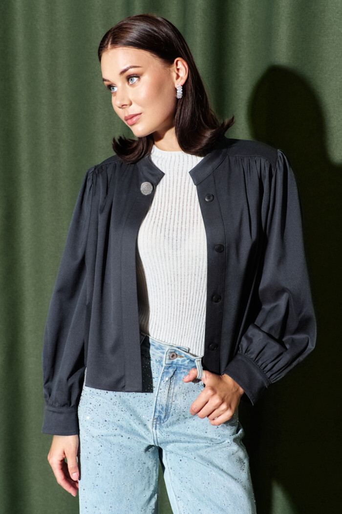 Блузка в стиле city chic выполнена из платьево-блузочного полотна. Модель расширенного силуэта. Горловина стойка. По центру переда — потайная застёжка на петли и декоративные пуговицы. По спинке и переду сборка, направленная от кокетки. Рукава втачные длинные со сборкой вдоль застёгивающейся манжеты. В качестве декора к изделию прилагается съёмная брошь. Длина изделия 50 см, длина рукава 61 см.
