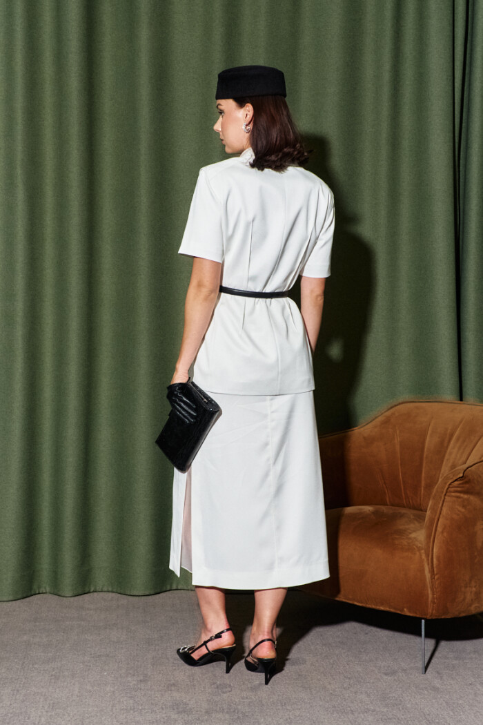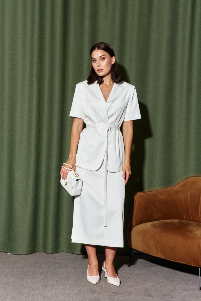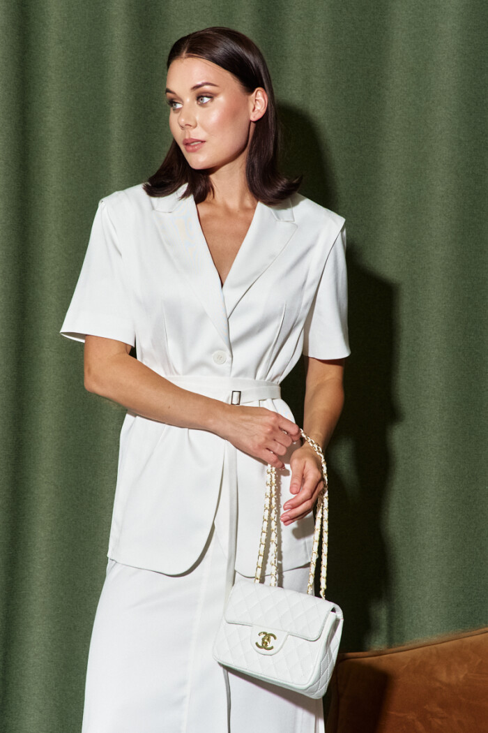 Оригинальный однобортный жакет на подкладке выполнен из костюмного полотна. Модель полуприлегающего силуэта с расширенной линией плеча. Воротник отложной с лацканами «ласточкино крыло». Особый вид изделию придаёт талиевые выточки, обработанные на лицо и по переду рельеф в виде складки переходящие в пройму спинке. Рукава втачные короткие. Длина изделия по спинке 71 см; длина рукава 26 см.