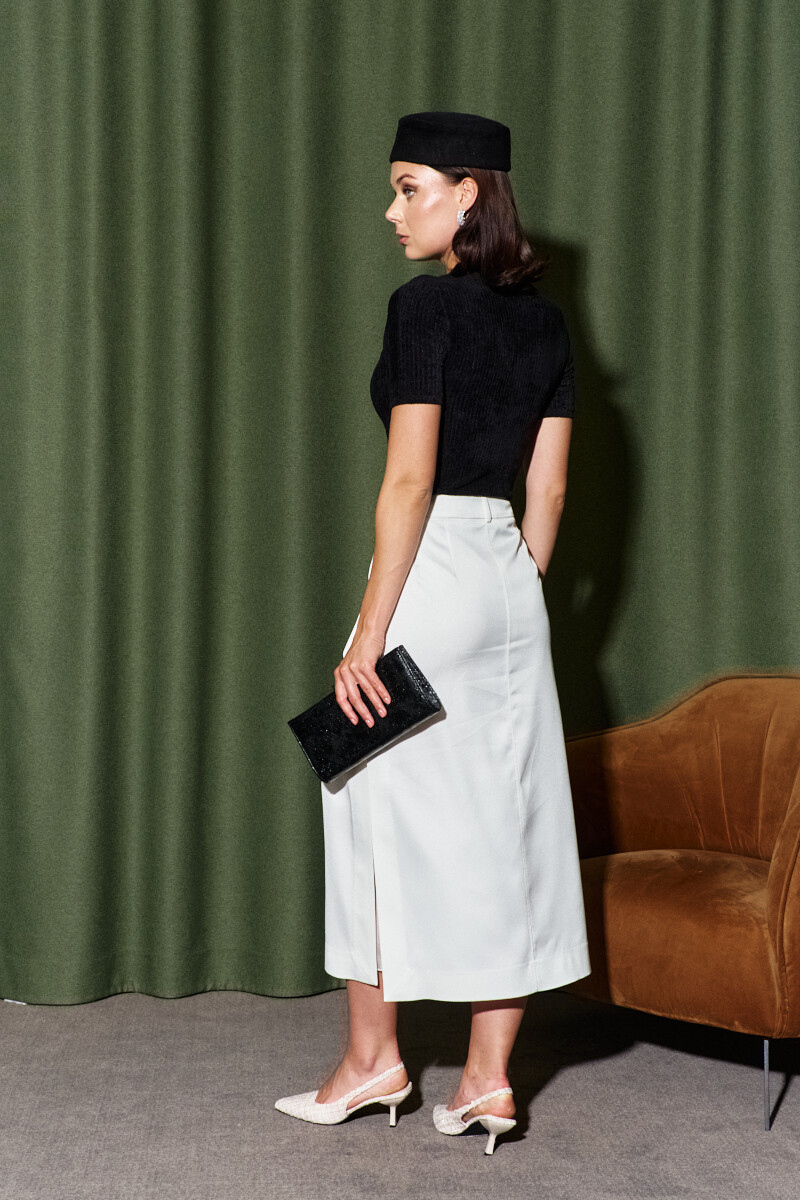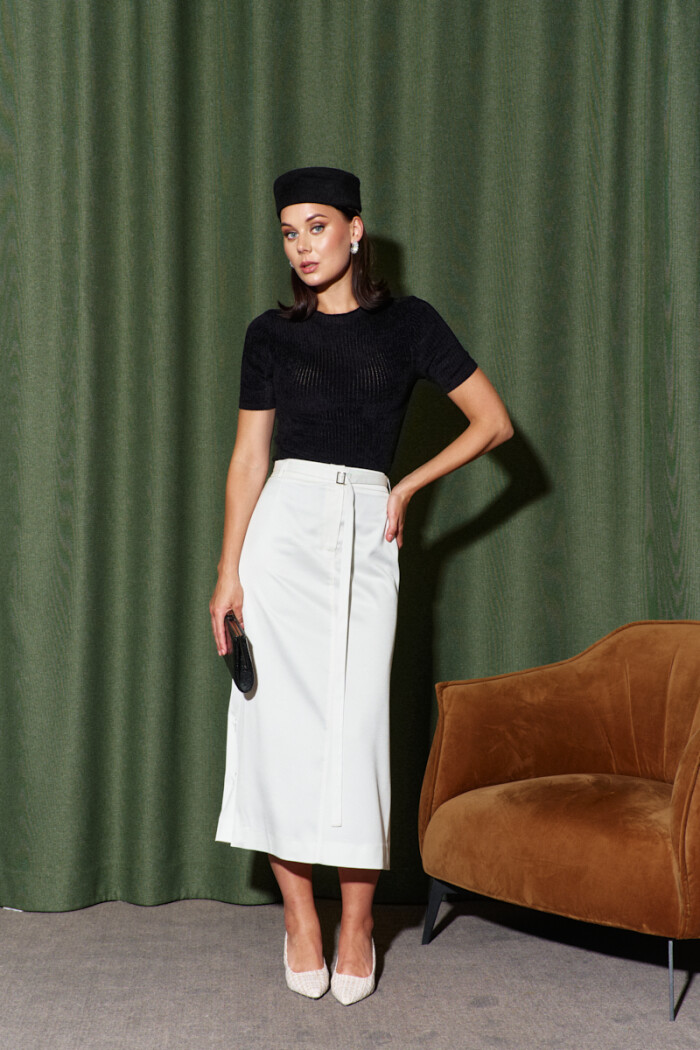 Элегантная двухслойная юбка, выполненная из костюмного полотна. Модель с комфортной средней посадкой. Для удобства в носке спереди предусмотрена застежкой на тесьму "молнию" и потайной крючок. В боковых швах разрезы. Особым декоративным элементом является отлетная понизу подкладка из ткани-компаньона вуаль. Юбка комплектуется съёмным поясом из основного полотна с металлической пряжкой. Длина изделия 86 см.