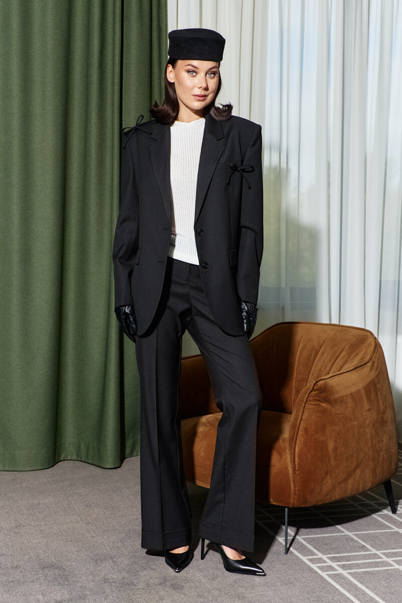 Элегантные брюки выполнены из костюмного полотна. Модель с комфортной средней посадкой, на притачном узком поясе. Спереди предусмотрены косые карманы, застёжка на тесьму, молнию и на потайные брючные крючки. На задних половинах брюк имитация прорезного кармана "с листочкой". Особым декоративным элементом является цельнокроеная манжета, оформлена через складку. Длина изделия (с поясом) 109см.