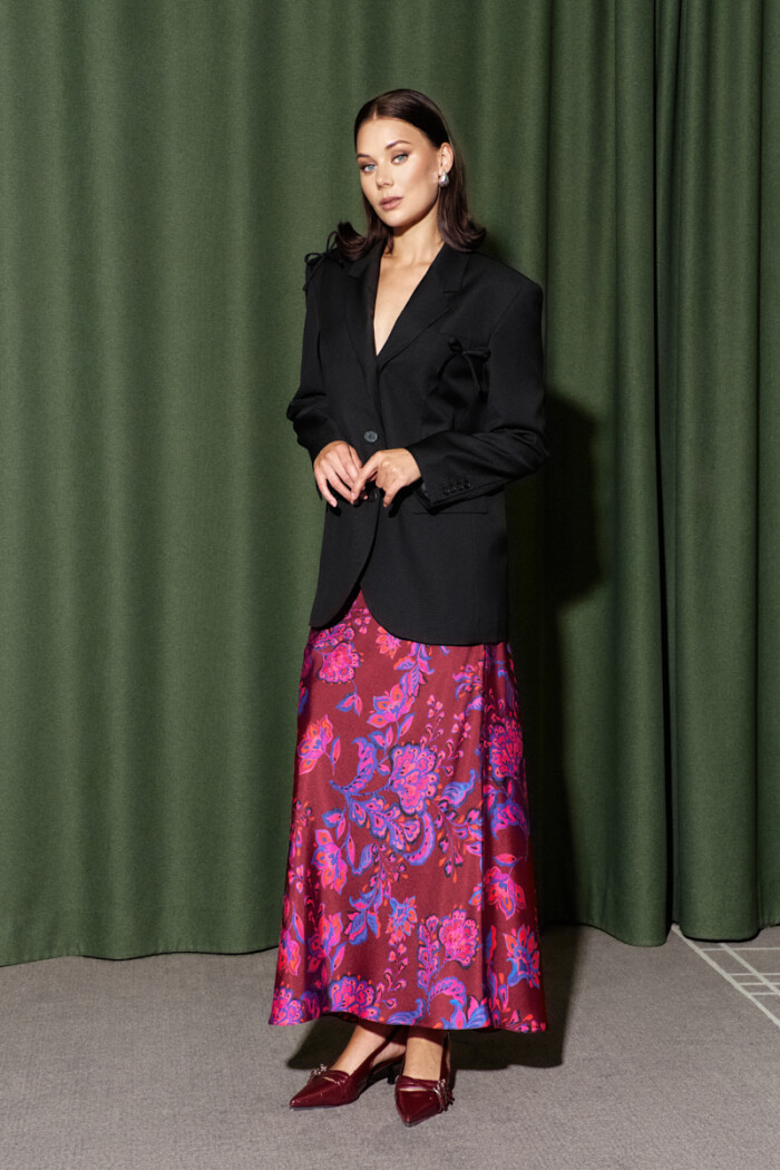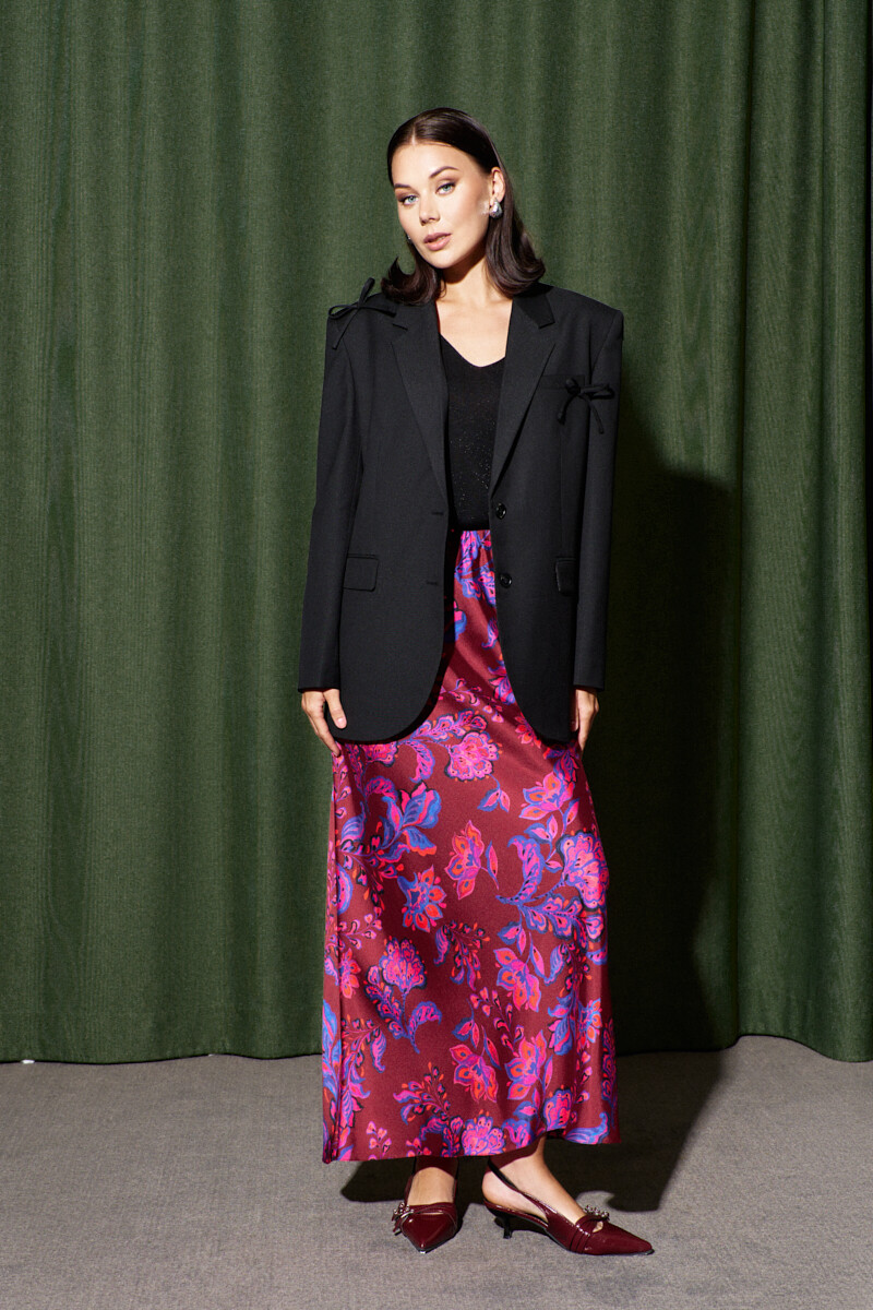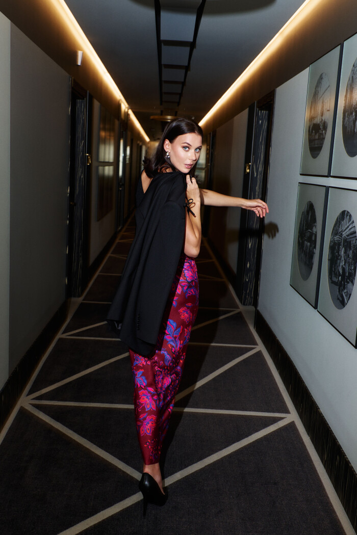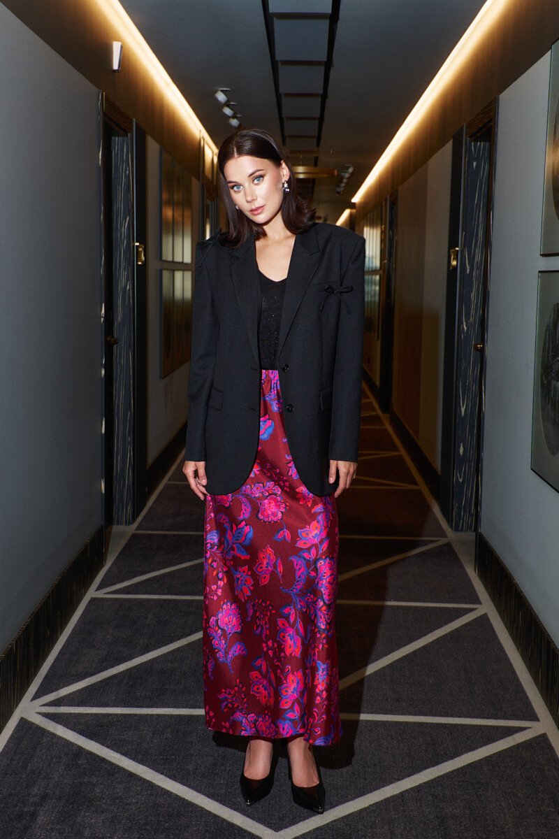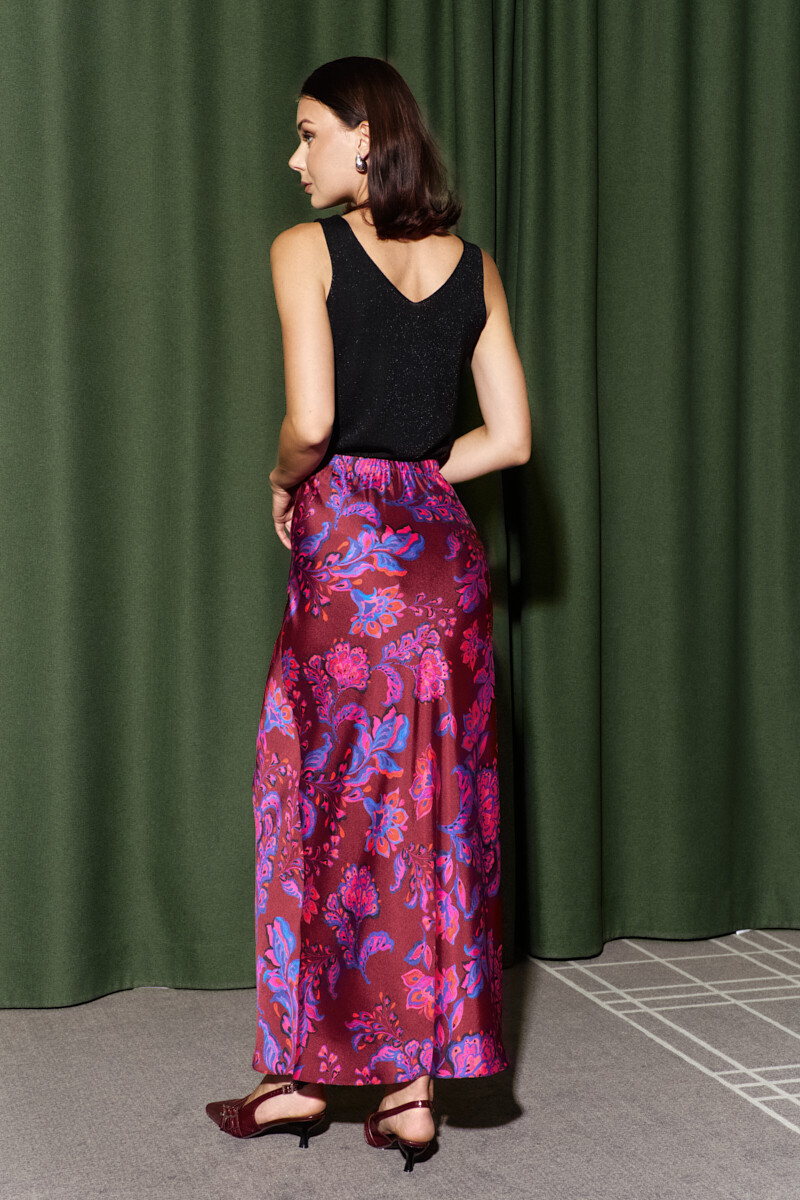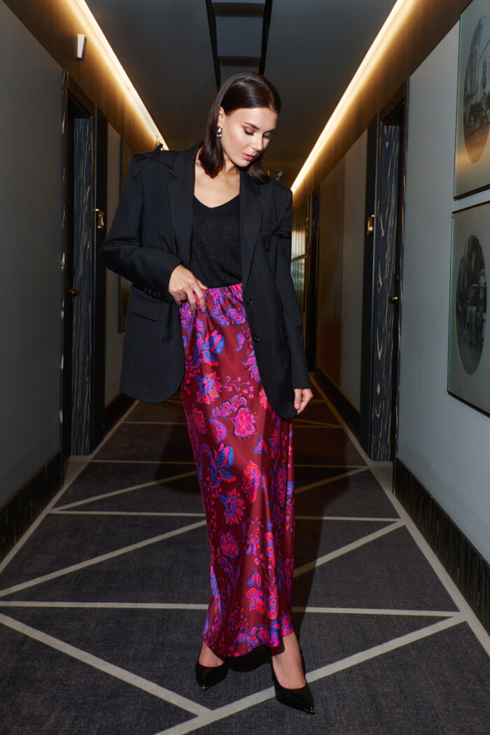 Элегантная юбка в стиле city chic выполнена из французского полотна с анималистическим принтом. Силуэт модели определяется косым кроем. Для удобства в носке в цельнокроеном поясе предусмотрена эластичная лента. Длина юбки по боковому шву 101 см.
