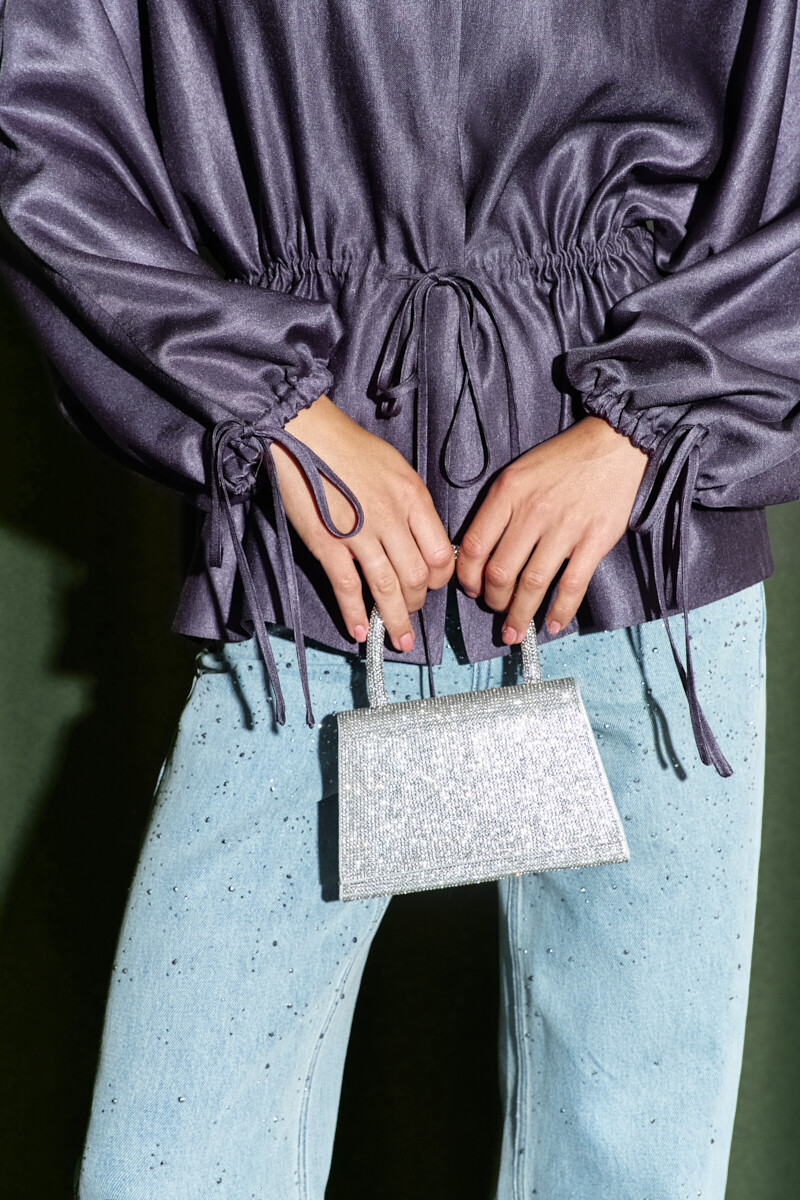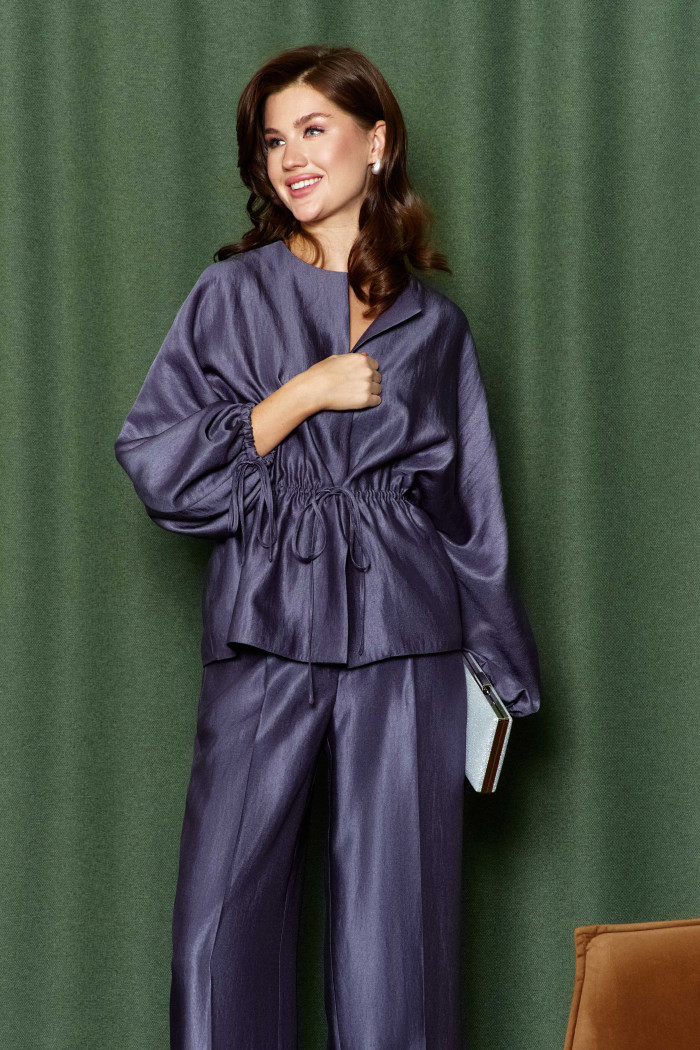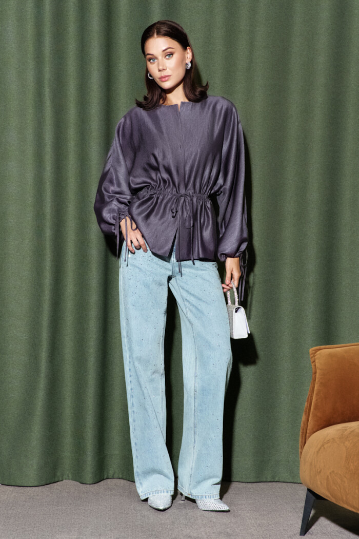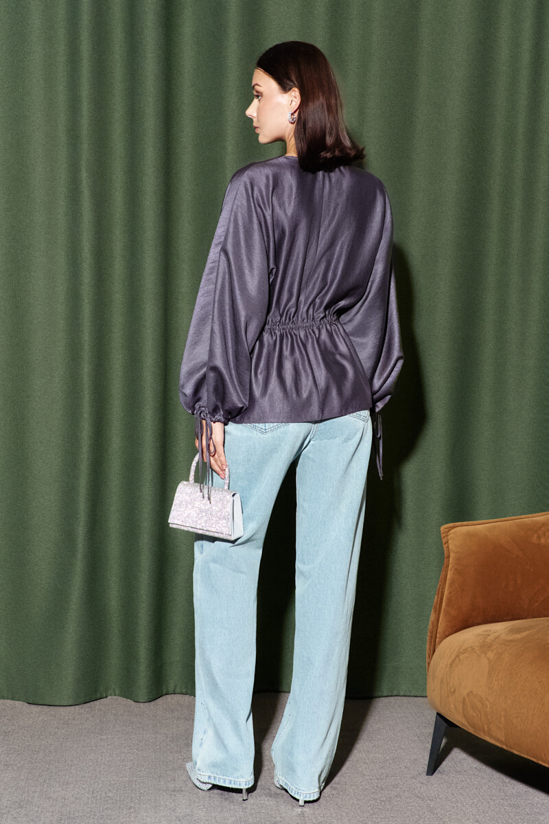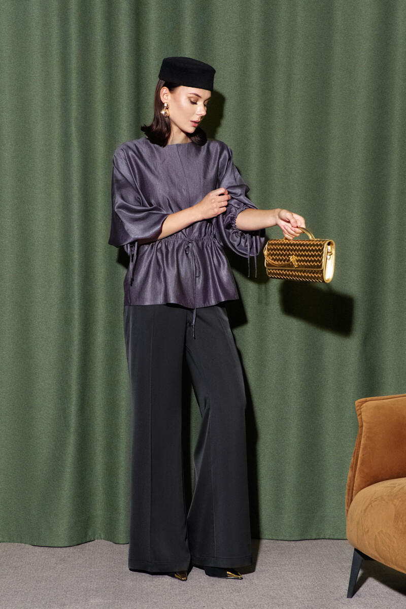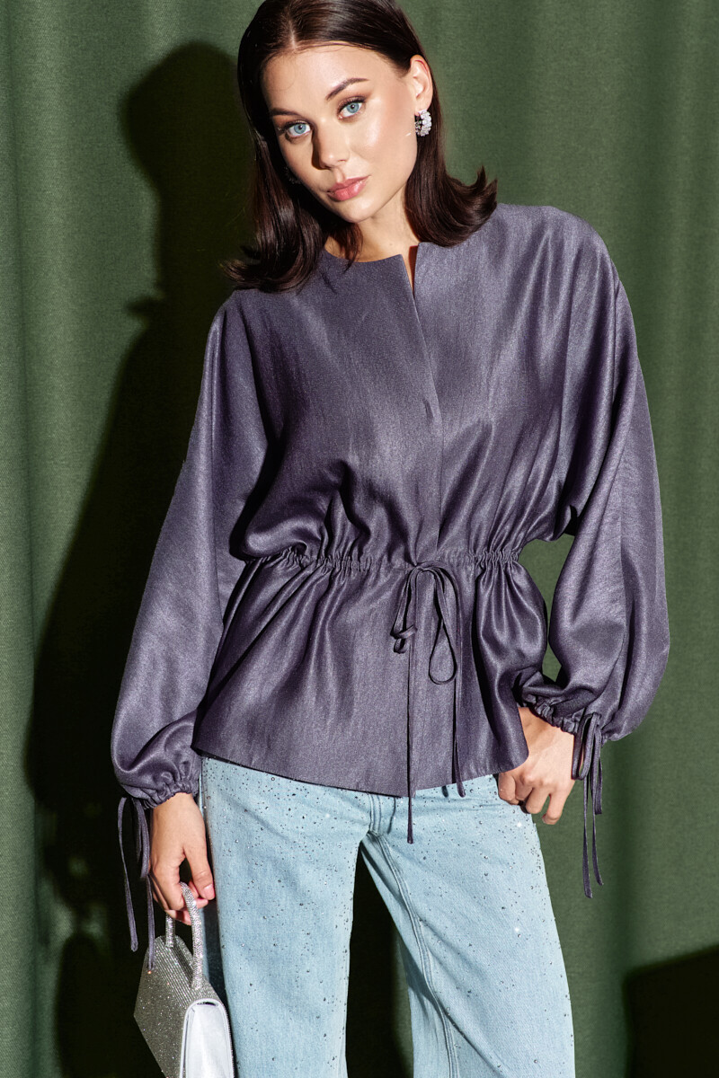 Блузка в стиле city chic выполнена из плательного полотна с благородным блеском. Модель прямого силуэта с кулисой на линии талии и с завязывающимся узким пояском из основного полотна. Горловина круглая. Спереди расположена застежка на пришивные кнопки от талии до линии чуть выше груди. Спинка выполнена со средним швом. Для удобства в носке предусмотрены карманы в боковых швах. Рукава цельнокроеные, объемные, с кулисой по низу и узким пояском. Длина изделия 64 см, длина рукава (от горловины) 70 см.