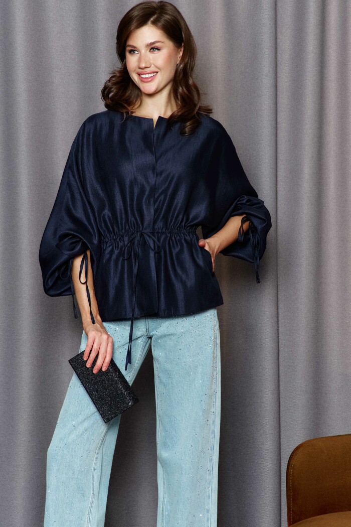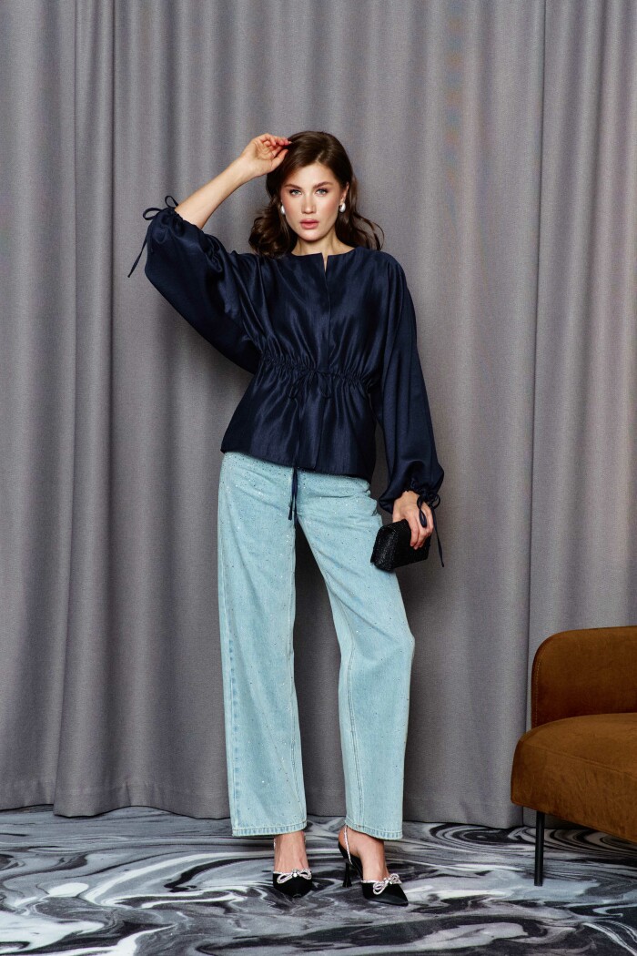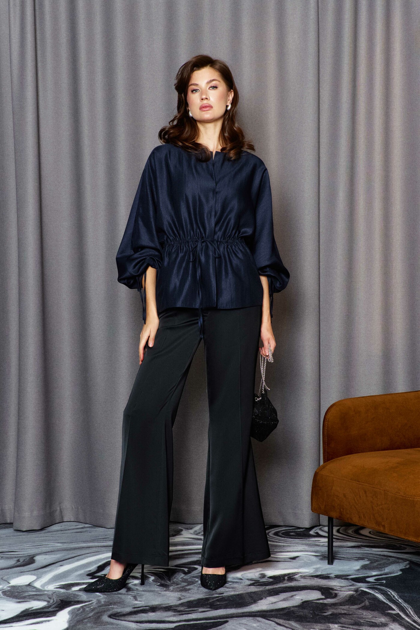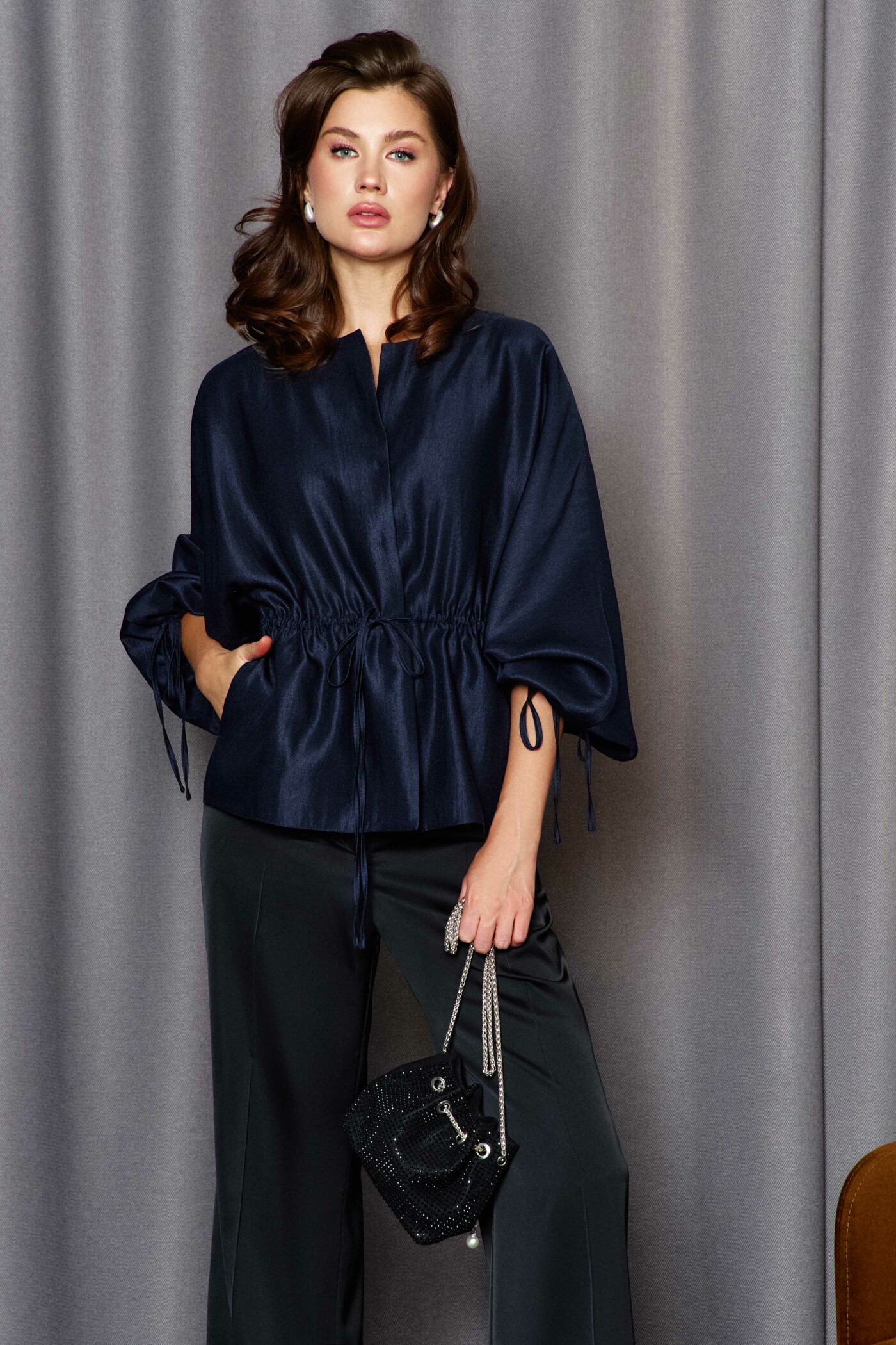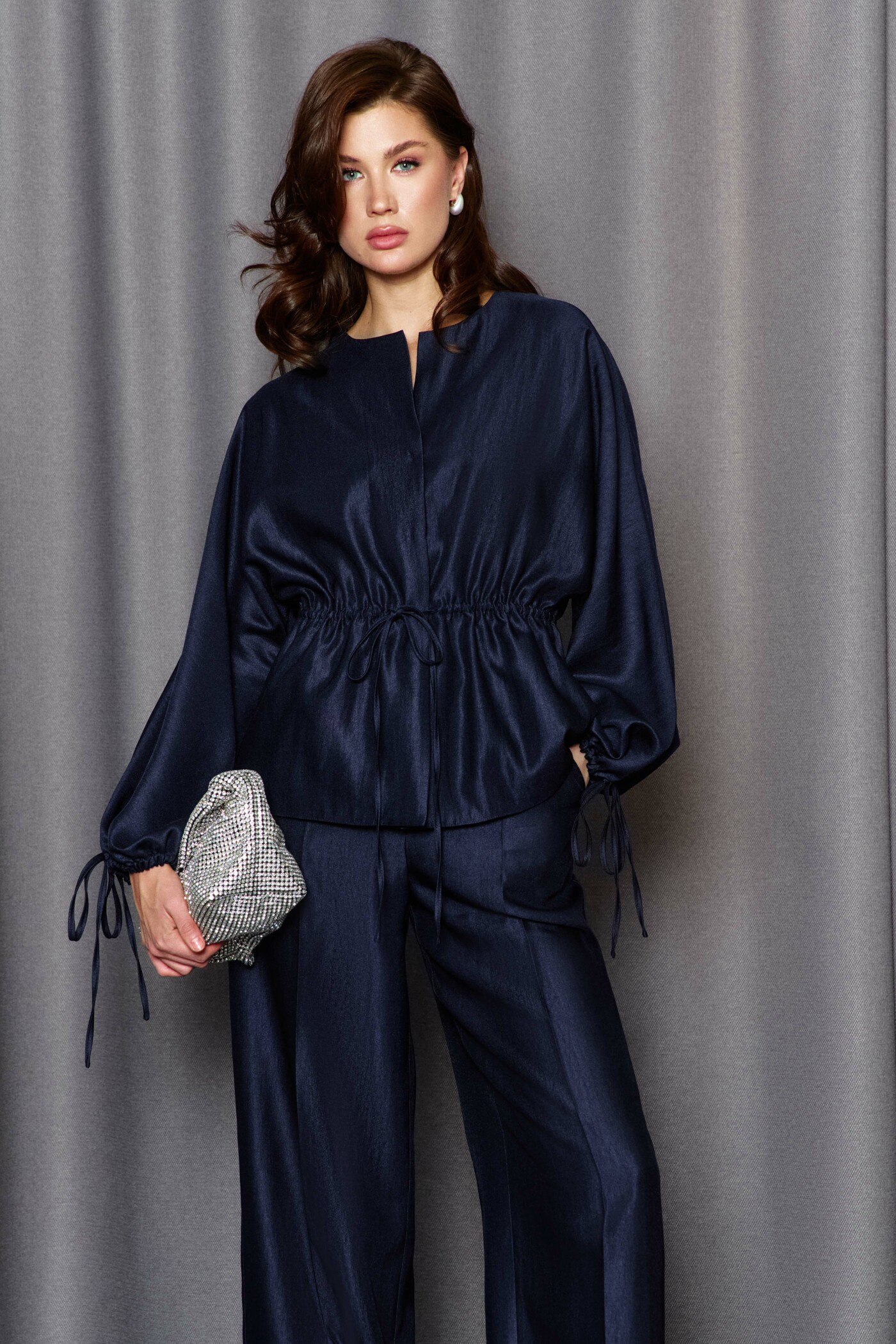 Блузка в стиле city chic выполнена из плательного полотна с благородным блеском. Модель прямого силуэта с кулисой на линии талии и с завязывающимся узким пояском из основного полотна. Горловина круглая. Спереди расположена застежка на пришивные кнопки от талии до линии чуть выше груди. Спинка выполнена со средним швом. Для удобства в носке предусмотрены карманы в боковых швах. Рукава цельнокроеные, объемные, с кулисой по низу и узким пояском. Длина изделия 64 см, длина рукава (от горловины) 70 см.