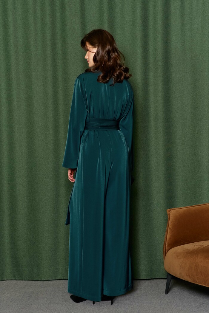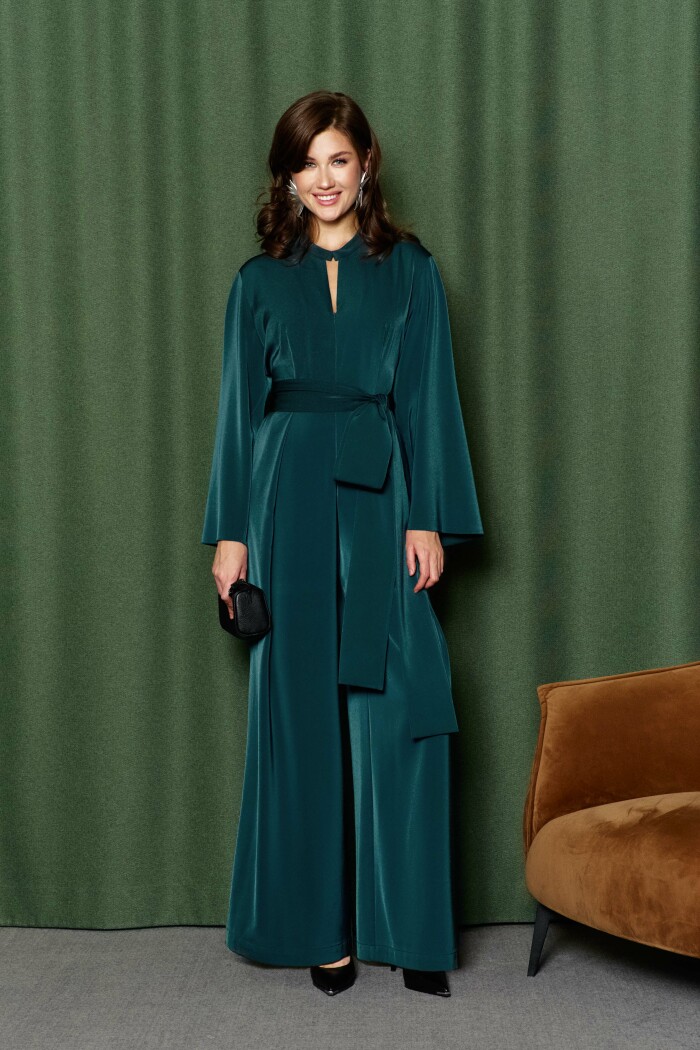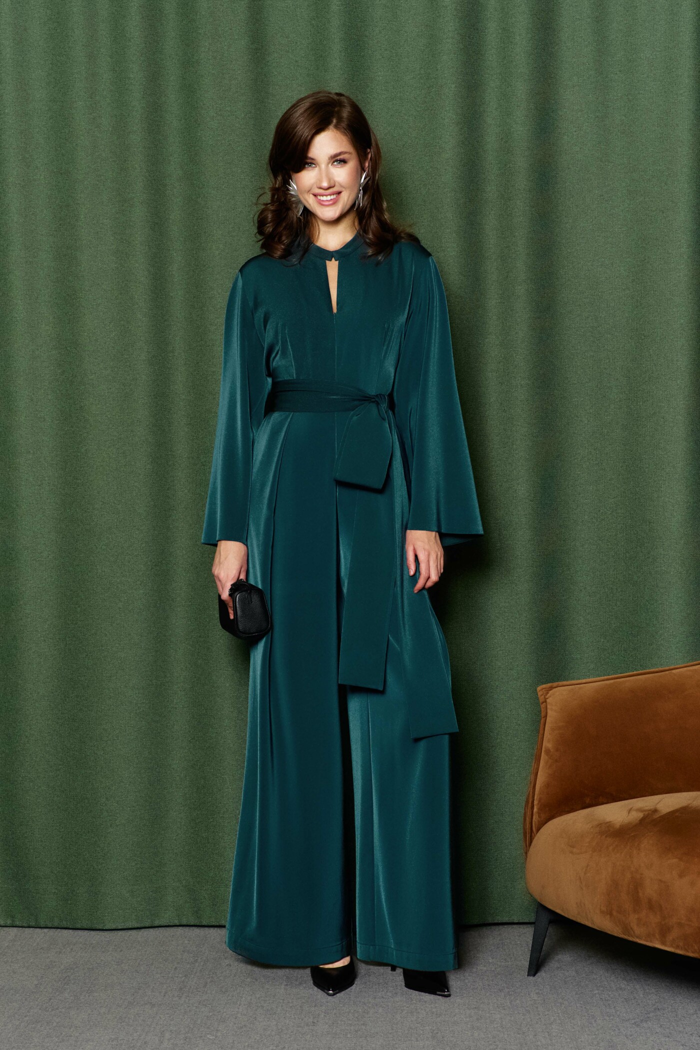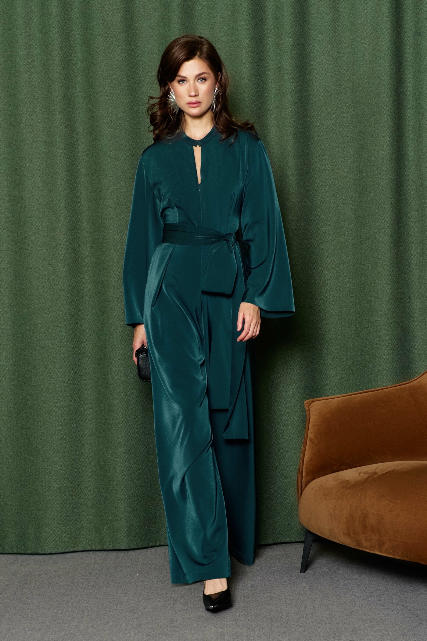 Элегантный комбинезон в стиле City Chic выполнен из струящегося полотна с благородным блеском. Модель полуприлегающего силуэта, отрезной по линии талии. V-образный вырез горловины со стойкой на потайную пуговицу и на навесную петельку. Для удобства в носке спереди предусмотрена потайная застёжка на тесьму "молнию". Перед декорирован втачными длинными поясами, которые дважды опоясывают талию. Брюки со складками по линии талии и косыми карманами. Длина спинки 40 см; длина брюк по боковому 114 см; длина рукава 60 см.