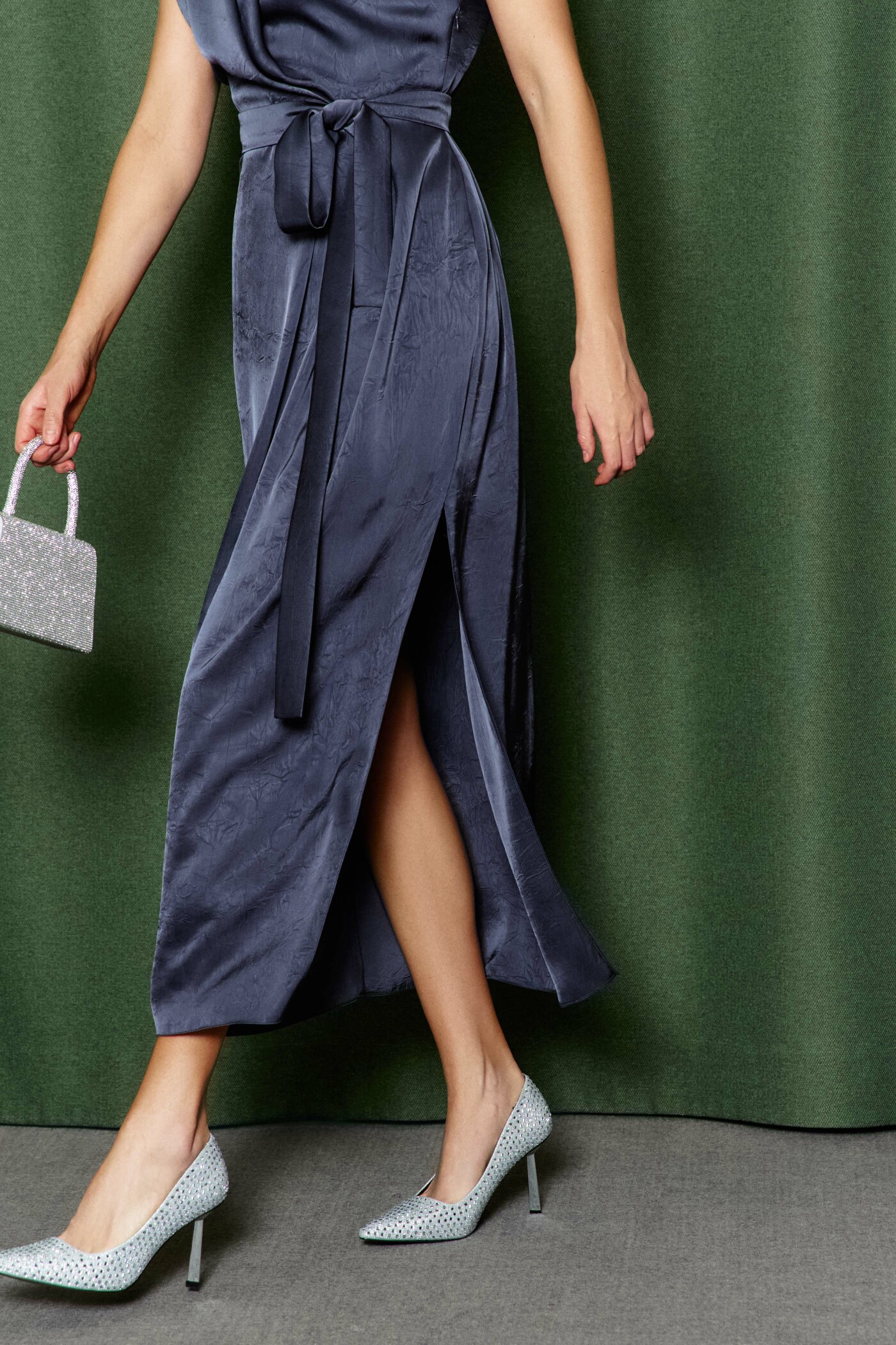Женственное платье в стиле city chic выполнено из струящегося полотна с благородным блеском. Модель полуприлегающего силуэта, отрезная по линии талии. Горловина круглой формы. Лиф переда с отделочной деталью, имеющей мягкую драпировку, и расширенной линией плеча со сборкой и плечевой накладкой. Для удобства в носке в среднем шве спинки, боковом шве – короткая потайная тесьма «молния». По переду юбки заложены складки и разрез в левом боку. Платье на подкладке из вискозного полотна. Изделие дополнено съёмным поясом из основного полотна. Длина изделия 140 см.