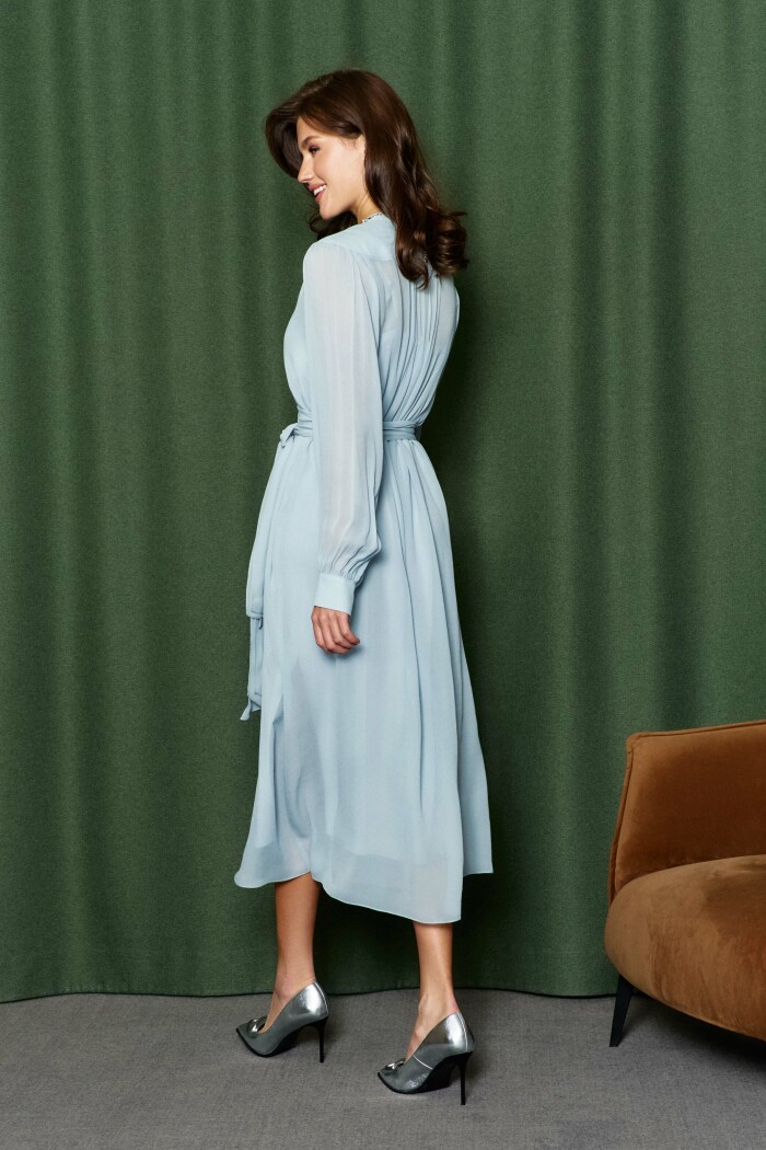 Платье в стиле City Chic выполнена из полупрозрачного вискозного полотна. Модель полуприлегающего силуэта. V-образная горловина, переходящая в стойку по спинке. По верхним срезам переда и рукава — сборка. Для удобства в носке в среднем шве переда потайная тесьма-молния. Спинка платья с фигурной кокеткой от плечевых швов. Рукава длинные реглан со сборкой вдоль застегивающейся манжеты. Особый вид изделию придают длинные втачные пояса, которые дважды опоясывают талию. Модель комплектуется комбинацией из вискозного полотна на регулируемых по длине бретелях. Длина изделия 128 см; длина рукава от горловины 70 см.