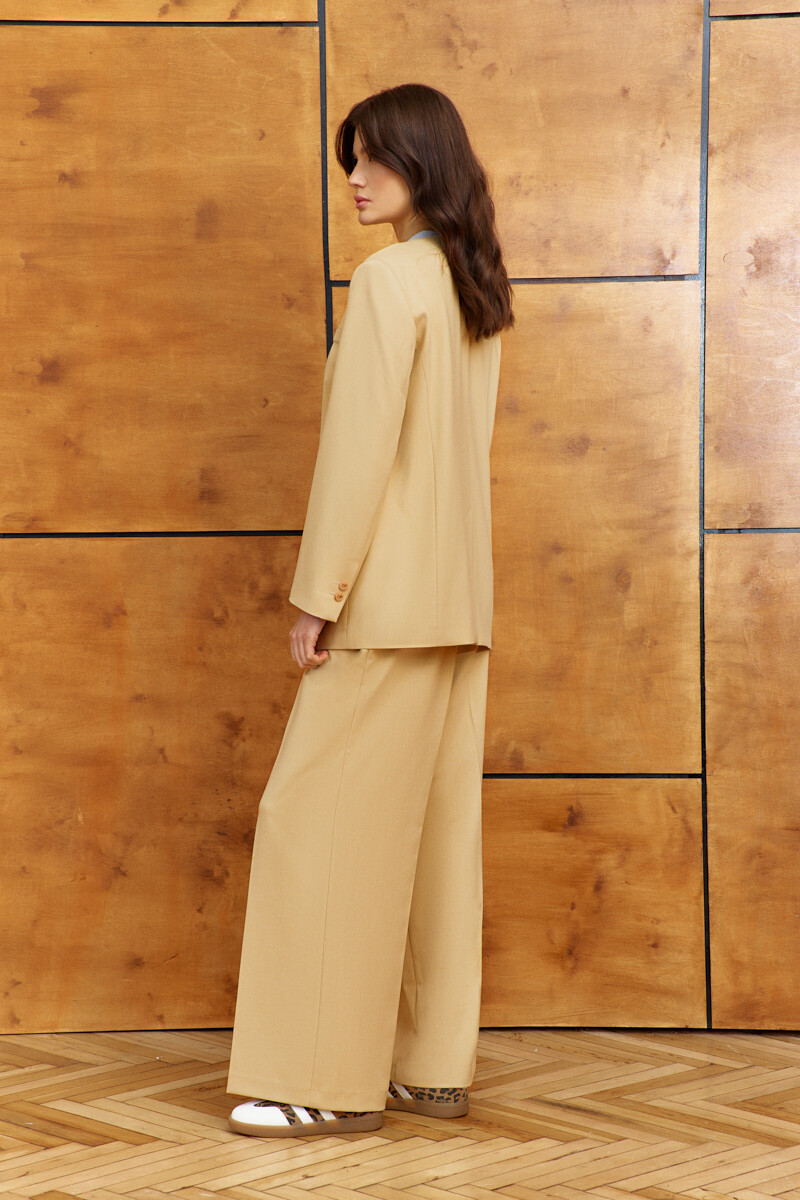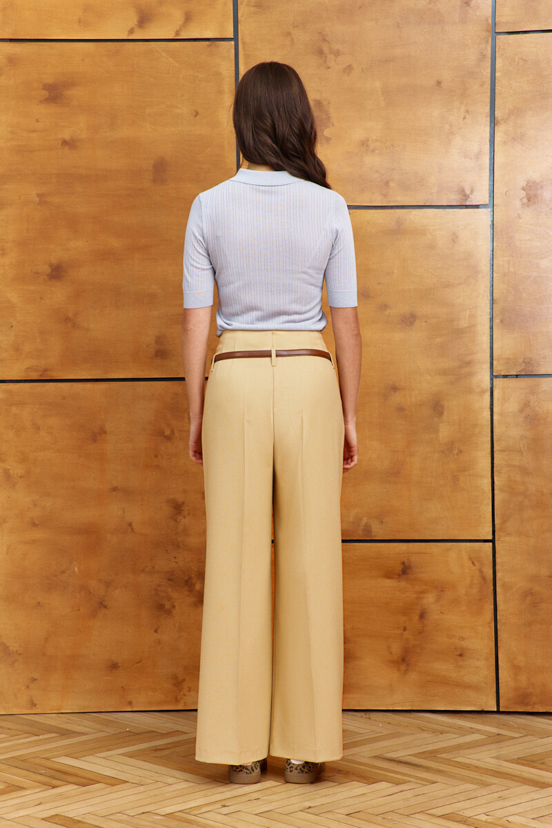 Классические брюки прямого силуэта выполнены из костюмного полотна. Модель полуприлегающего силуэта с комфортной высокой посадкой, застегивающимися на потайной брючный крючок. Особый вид изделию придают декоративное расположение шлевок. Спереди предусмотрены карманы в боковых швах. Длина изделия по боковому шву 113 см.