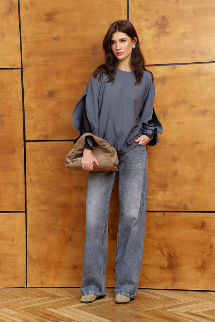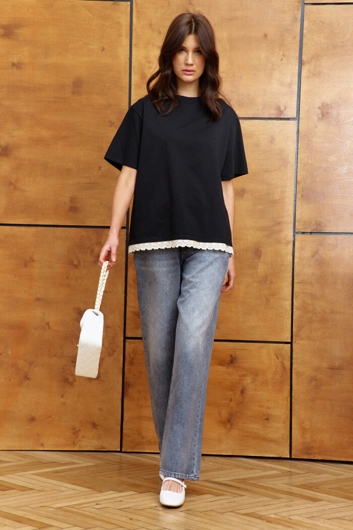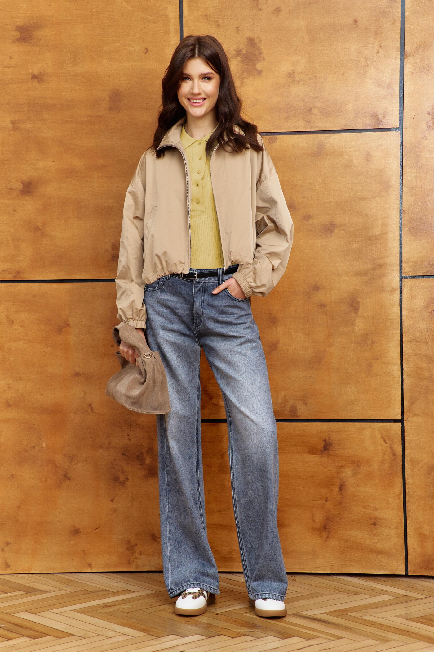 Брюки в стиле smart casual выполнены из хлопкового джинсового полотна. Модель с комфортной высокой посадкой на притачном поясе со шлёвками и застёгивающемся на декоративную пуговицу. Спереди предусмотрены карманы с отрезным бочком и застёжка на "молнию", сзади накладные карманы. Модель декорирована наличием отделочных строчек. Длина изделия по боковому шву (с поясом) 108 см.
