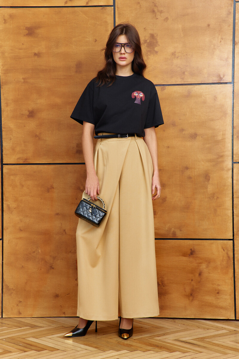 Элегантные брюки выполнены из костюмного полотна. Модель с комфортной средней посадкой, на притачном поясе со шлевками и эластичной лентой по спинке. Спереди заложены складки и обработаны функциональные карманы в боковом шве. Особым декоративным элементом является цельнокроеная отлетная деталь переда, которая фиксируется на поясе потайными брючными крючками. Для удобства в носке спереди предусмотрена застёжка на тесьму «молнию». На задней части половинки брюк выполнен декоративный прорезной карман «с листочкой». Длина изделия (с поясом) 113см.