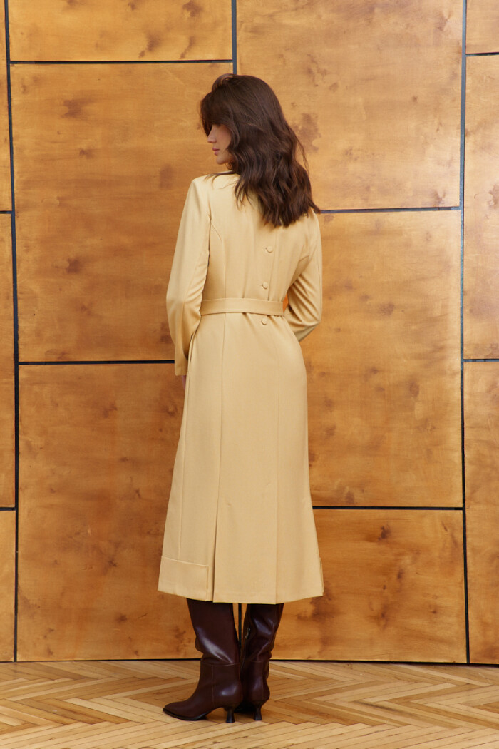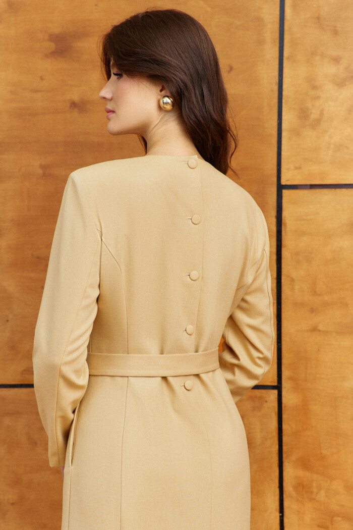 Платье в стиле smart casual выполнено из костюмно-плательного полотна. Модель полуприлегающего силуэта с круглой горловиной. На переде платья стачаны нагрудные вытачки от боковых швов к центру груди и талиевые, от которых до низа заутюжены стрелки и пришиты на уровне талии декоративные пуговицы. По низу переда платья пришита планка с отворотом, слегка переходящая на спинку. Спинка платья со средним швом, в котором расположена шлица и выполнена застёжка-петля и декоративные пуговицы. Рукава длинные втачные. Модель комплектуется съёмным поясом из основного полотна для фиксирования на талии. Длина изделия 125 см, длина рукава 59 см.