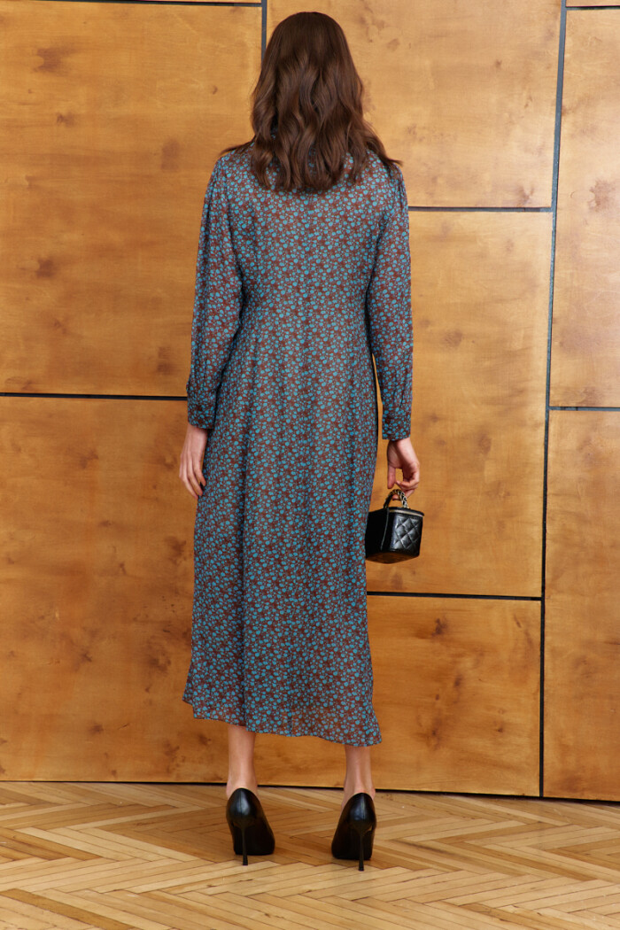 Платье в стиле smart casual выполнено из струящегося вискозного полотна с дизайнерским принтом. Модель полуприлегающего силуэта слегка расширяется к низу. Воротник отложной на стойке. Спереди предусмотрена цельнокроеная планка на петлях и декоративные пуговицы. По спинке и переду выполнены рельефы. Рукава втачные, длинные, со сборкой по окату и складками вдоль застегивающейся манжеты. Модель комплектуется комбинацией из вискозного полотна на регулируемых по длине бретелях. Длина по спинке 132 см; длина рукава 60 см.