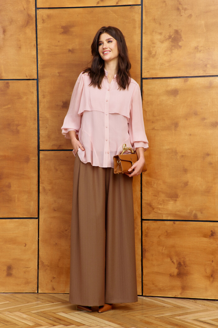 Элегантные брюки выполнены из костюмного полотна с актуальным дизайном "ёлочка". Модель с комфортной средней посадкой, на притачном поясе и эластичной тесьмой по спинке, застёгивающейся на потайной брючный крючок. Для удобства в носке спереди предусмотрены карманы с отрезным бочком и застежка на тесьму «молнию. Особым декоративным элементом является спереди деталь в виде складки от пояса до низа, которая фиксируется на поясе на петли и декоративные пуговицы. Длина изделия (с поясом) 112 см.