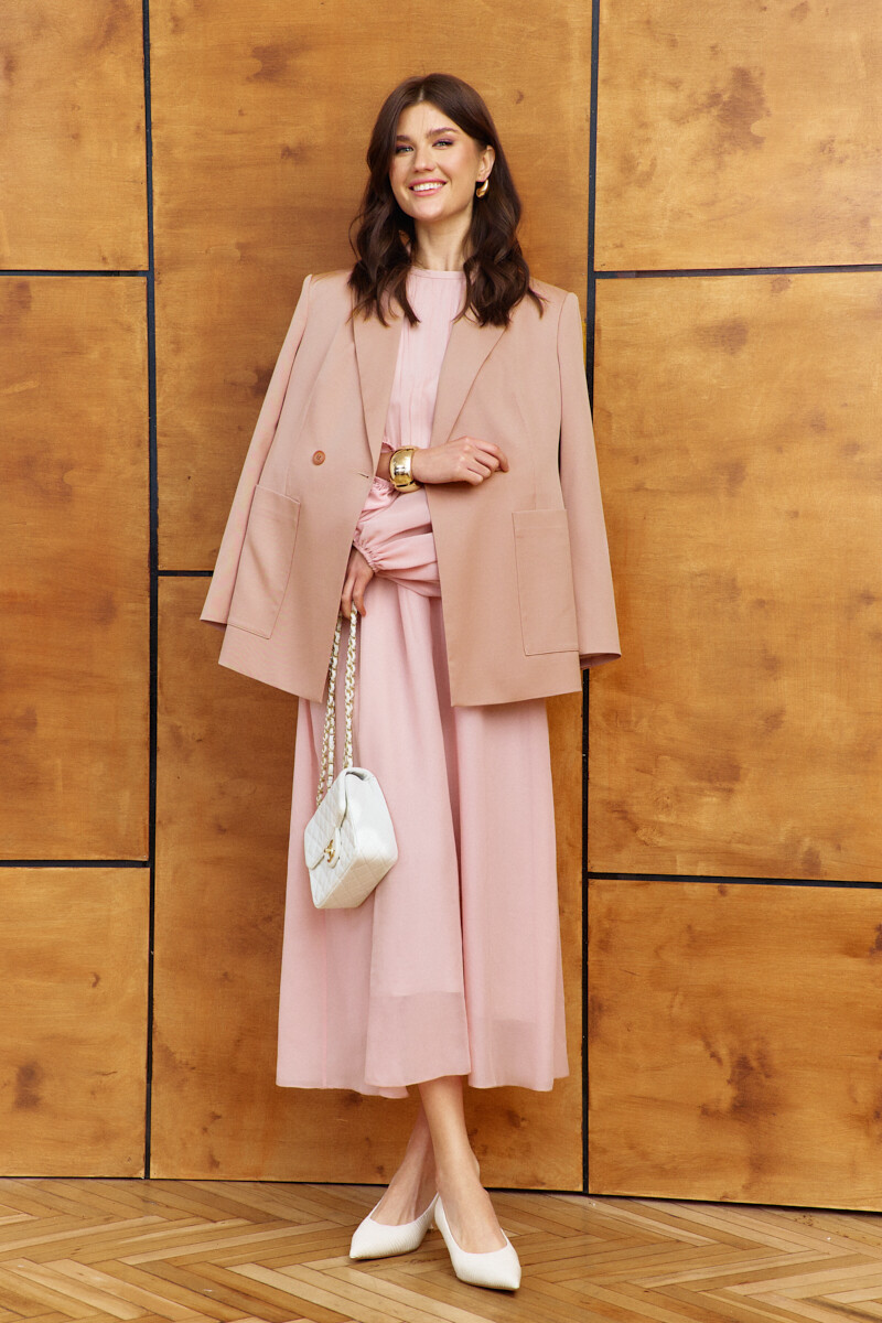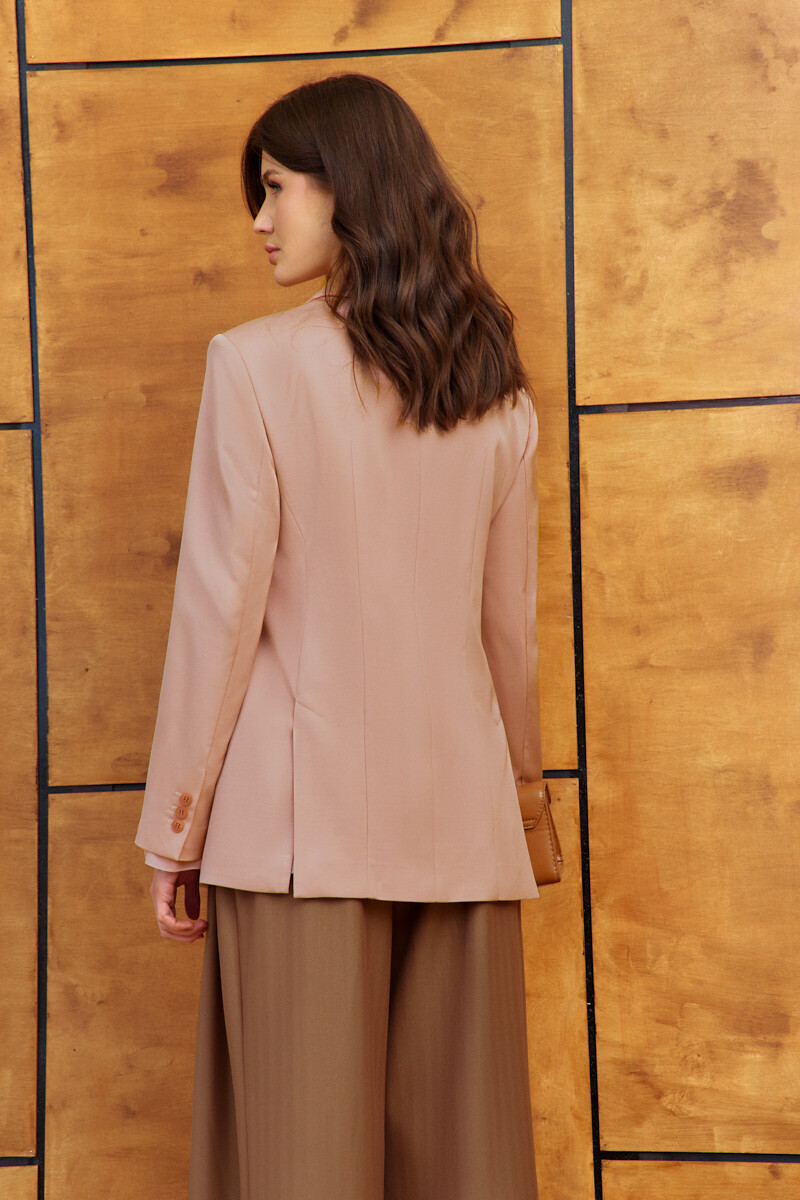 Оригинальный двубортный жакет на подкладке выполнен из костюмной ткани. Модель прямого силуэта с лацканами «ласточкино крыло»; рукава длинные со шлицей. Спереди расположены накладные карманы, а рельефных швах спинки шлицы. Длина изделия 73 см.; длина рукава 61 см.