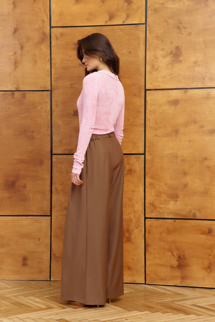 Джемпер прилегающего силуэта выполнен из мягкого, эластичного, приятного на ощупь трикотажного полотна в рубчик. Модель с планкой на петли и декоративные пуговицы и отложным воротником. Рукава и низ изделия оформлены узкой манжетой в виде резинки. Длина изделия 57 см; длина рукава 64 см.