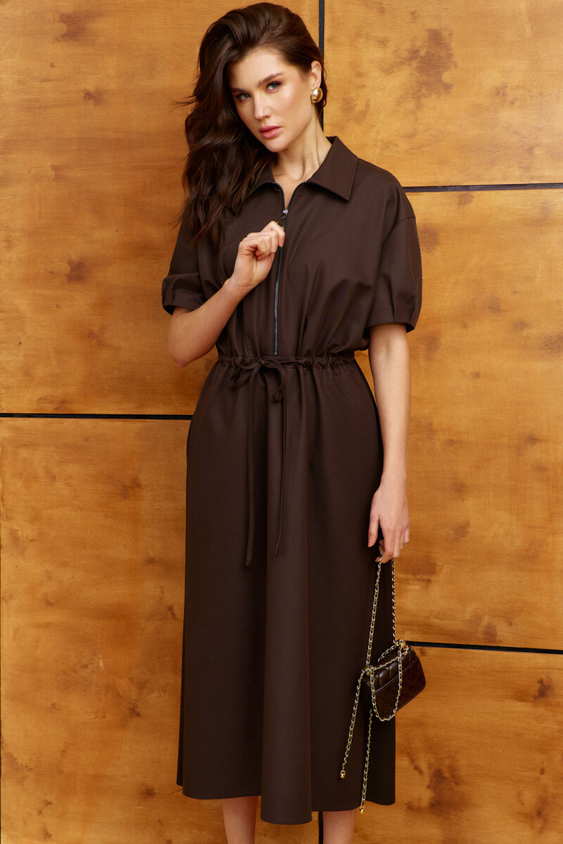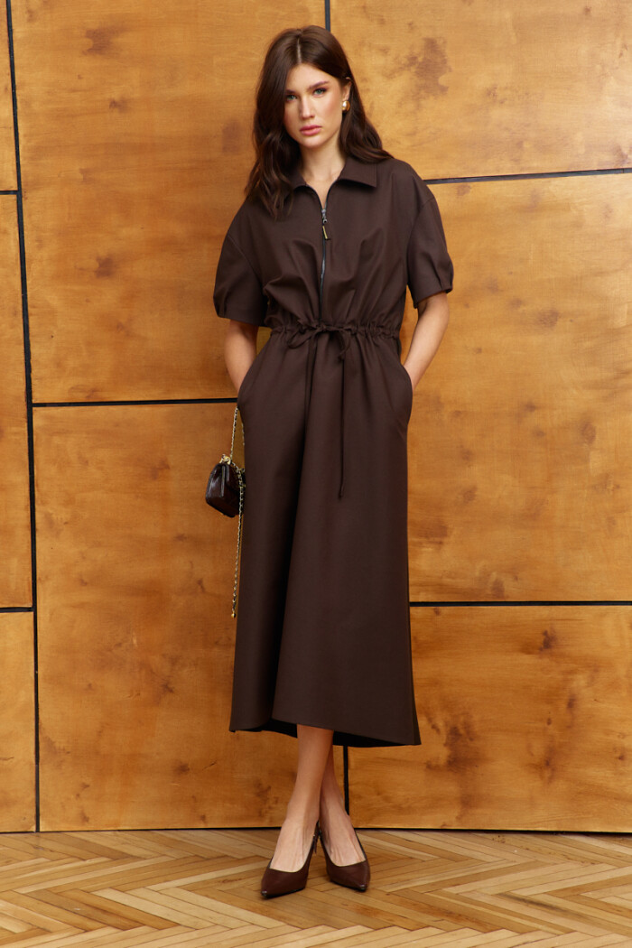 Элегантное платье выполнено из костюмно-плательная полотна. Модель полуприлегающего силуэта, отрезное по линии талии с кулисой, через которую протянут съёмный завязывающийся пояс-шнур из основного полотна. Воротник отложной на стойке. В среднем шве переда (до талии) застёжка на декоративную, металлическую тесьму молнию. Для удобства в носке в боковых швах выполнены функциональные карманы. По спинке две складки, направленные от кокетки до талии. Объёмные короткие рукава со складками и обтачкой по низу. Длина изделия 132 см, длина рукава (от горловины) 41 см.