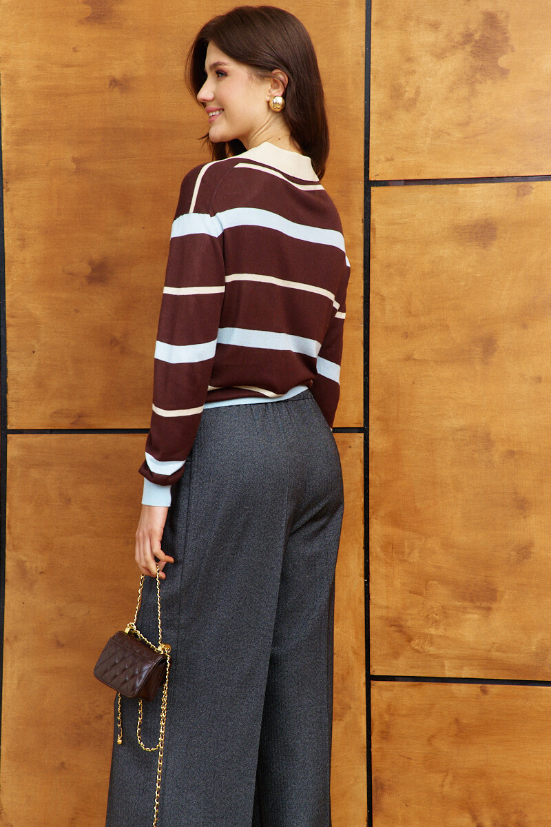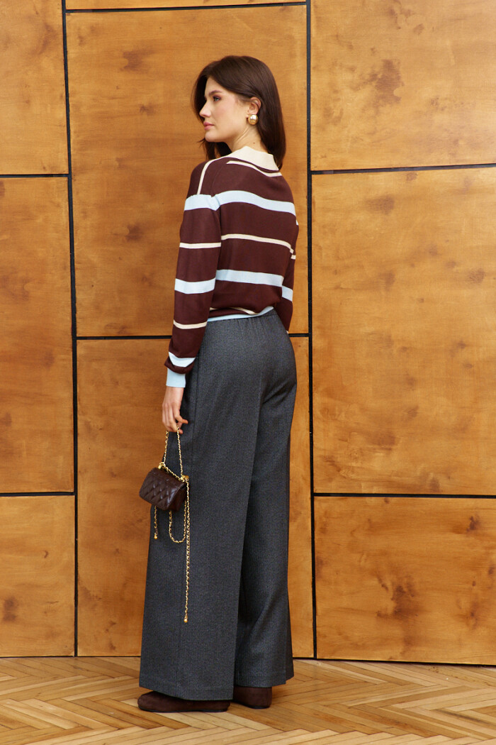 Джемпер прилегающего силуэта выполнен из мягкого, эластичного, приятного на ощупь трикотажного полотна с актуальным дизайном в горизонтальную полоску. Модель с планкой на петли и декоративные пуговицы и отложным воротником контрастного цвета. Рукава и низ изделия оформлены манжетой в виде резинки. Длина изделия 57 см; длина рукава 64 см.