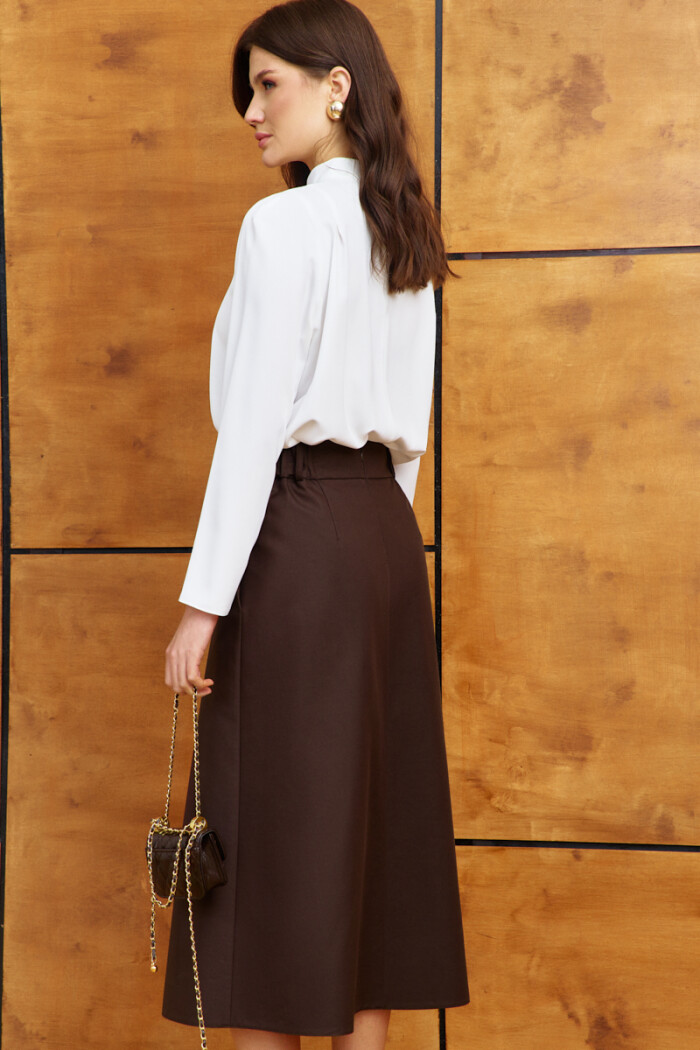 Юбка выполнена из костюмного полотна. Модель полуприлегающего силуэта с комфортной высокой посадкой по линии талии, на притачном поясе со шлёвками и эластичной лентой внутри по спинке. На переде с одной стороны заложена глубокая складка и предусмотрены функциональные карманы в боковых швах. Для удобства в носке предусмотрена в среднем шве спинки застёжка на потайную тесьму "молнию". Длина по боковому шву (с поясом) 85 см.