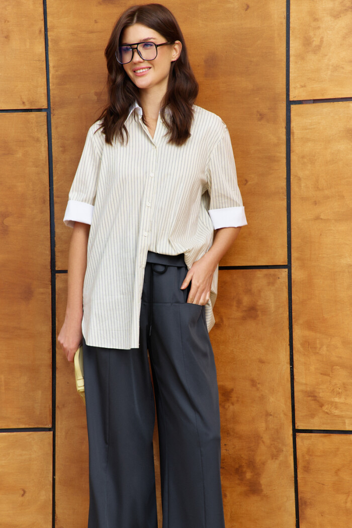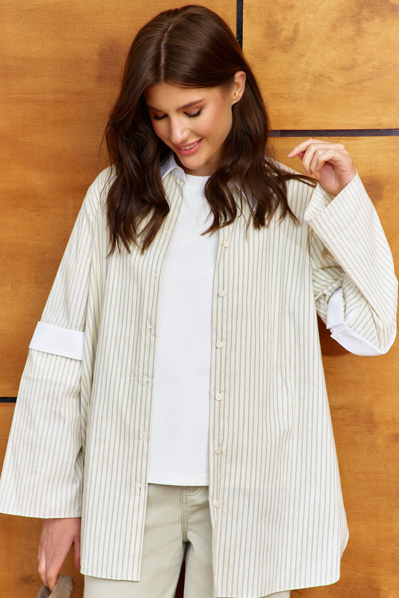 Блузка-рубашка выполнена из хлопкового полотна в полоску. Модель свободного силуэта со спущенной линией плеча. Воротник отложной на стойке из отделочного контрастного полотна. Спереди предусмотрена застежка на декоративные пуговицы. По спинке - глубокие модельные складки, направленные от кокетки. Особым декоративным элементом является рукава с пристегивающейся нижней частью на петли и пуговицы, по середине - на манжету из отделочного полотна, что дает возможность носить изделие с длинным рукавом и коротким. Длина изделия - 78 см. длина рукава - 58 см.