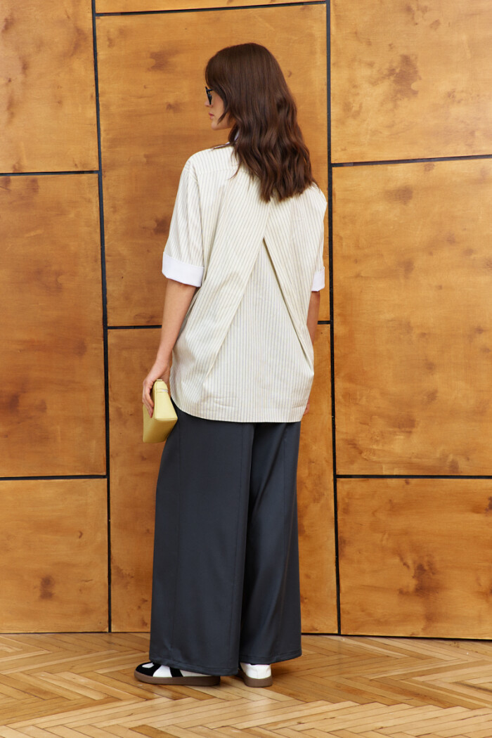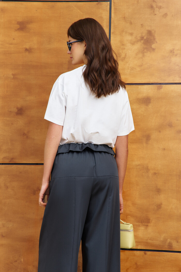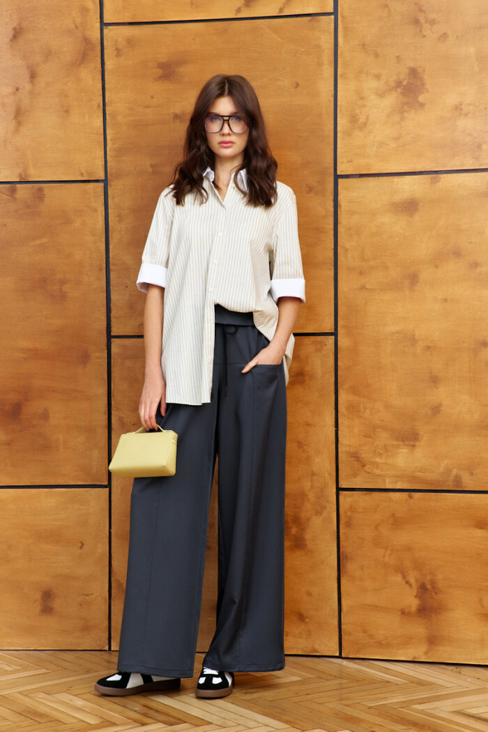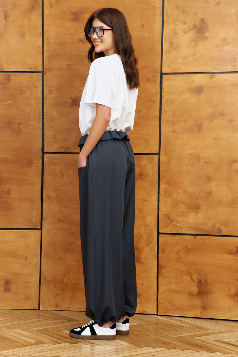 Элегантные брюки выполнены из костюмного полотна. Модель прямого силуэта с комфортной высокой посадкой. Притачной пояс с отворотам и кулисой, в которую вставлен по переду шнур, а эластичная лента по спинке. На переде и спинке горизонтальный подрез на линии бедер, а от подреза идут декоративные рельефы. Для удобства в носке спереди в подрезе оформлены карманы. Низ брюк с эластичной тесьмой и фиксатором. Длина по боковому шву 108 см.