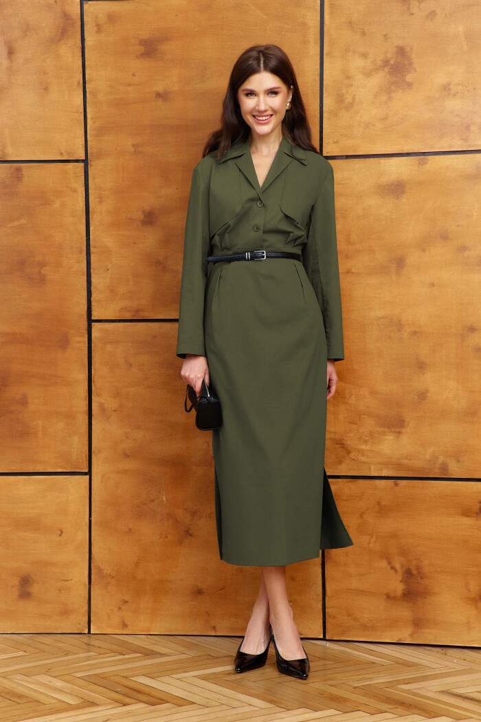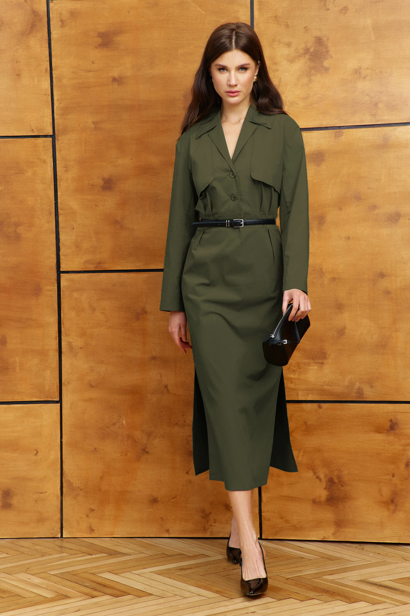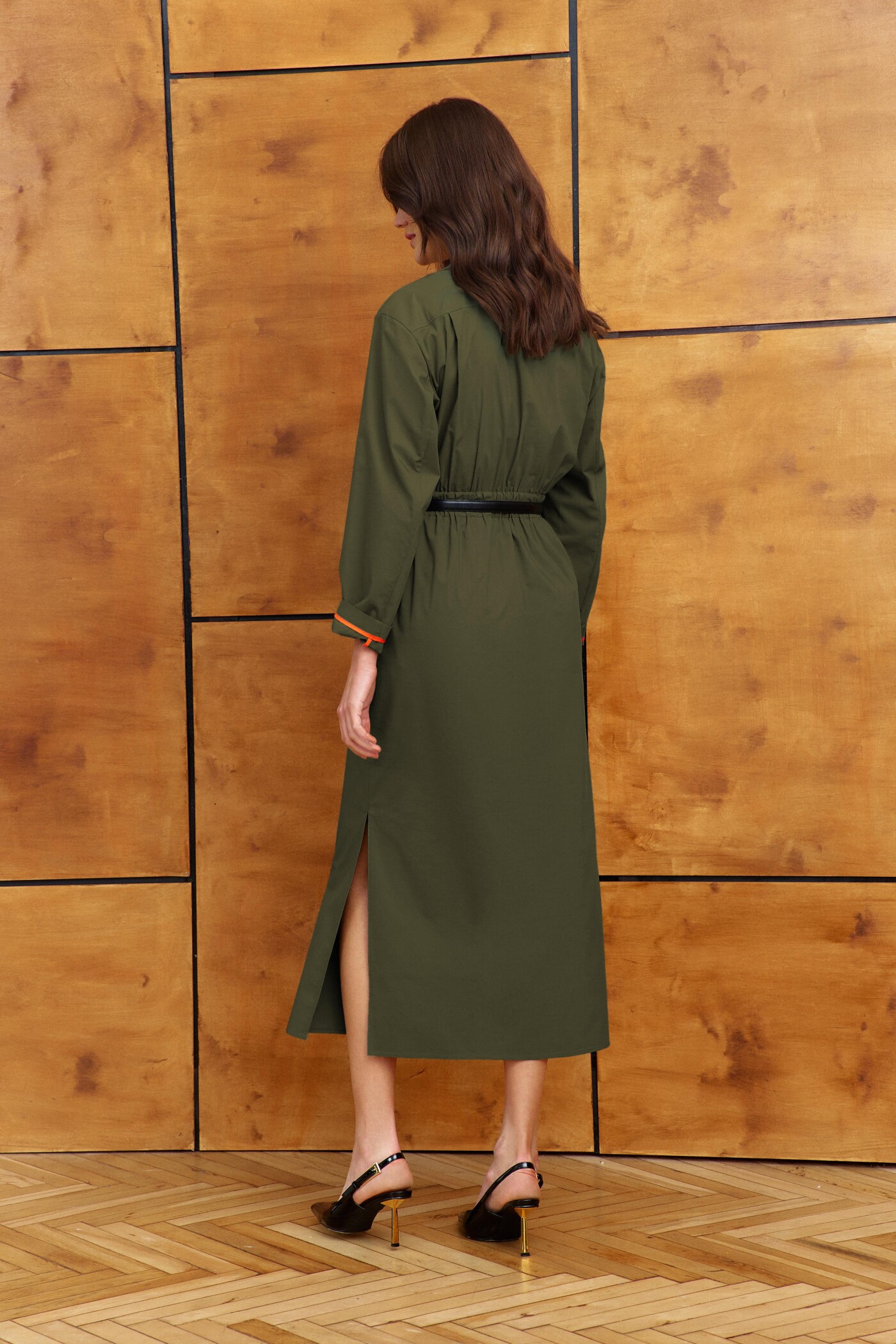 Элегантное платье выполнено из хлопкового полотна. Модель полуприлегающего силуэта, отрезная по линии талии с притачным поясом и эластичной тесьмой по спинке. Горловина оформлена отложным воротником с лацканами. Лиф платья с отлетными кокетками спереди и застёжка центрально-бортовая на декоративные пуговицы и петли до линии талии. Для удобства в носке в боковых швах выполнены функциональные карманы и разрезы. По спинке две складки, направленные от кокетки. Длинные двухшовные рукава. По желанию клиента платье может, дополнятся кожаным ремнем с металлической пряжкой. Длина изделия 132 см, длина рукава 58 см.