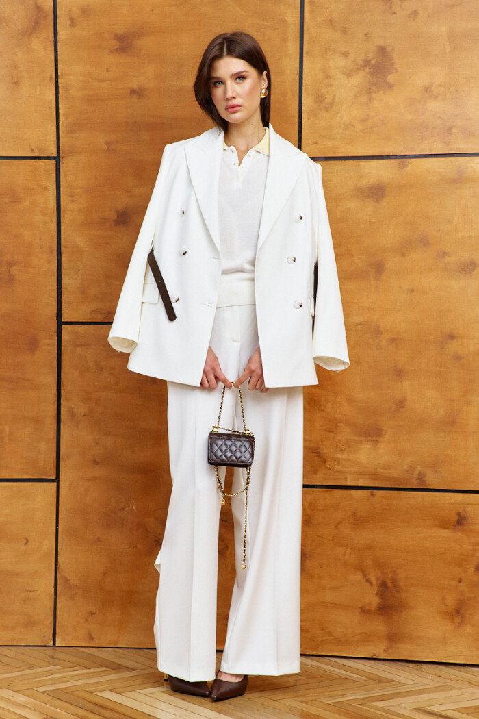 Двубортный классический жакет на подкладке, выполнен из костюмного полотна с актуальным дизайном "ёлочка". Модель прямого силуэта с лацканами «ласточкино крыло» и длинными двухшовными рукавами со шлицей. Для удобства в носке спереди предусмотрены прорезные карманы с клапаном. На линии талии расположена кулиса, через которую продевается ремень на металлическую пряжку. Длина по спинке 73 см; длина рукава 61 см.