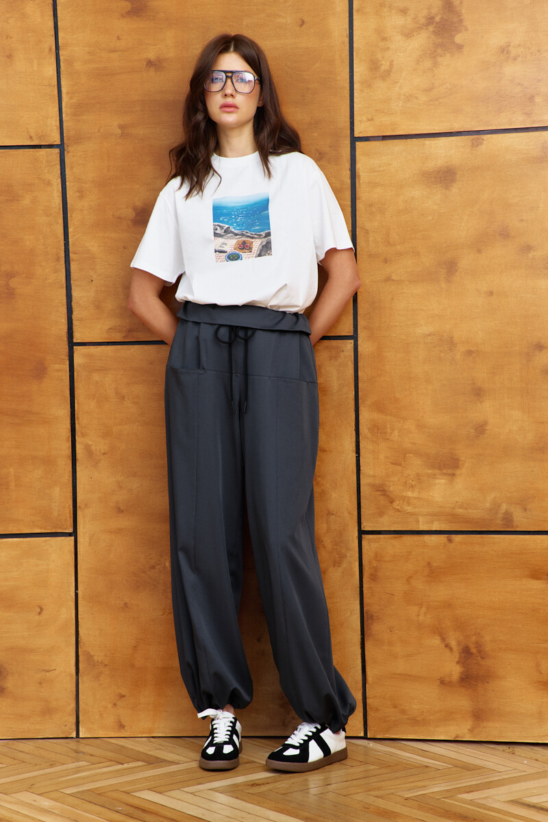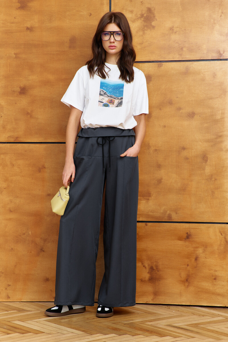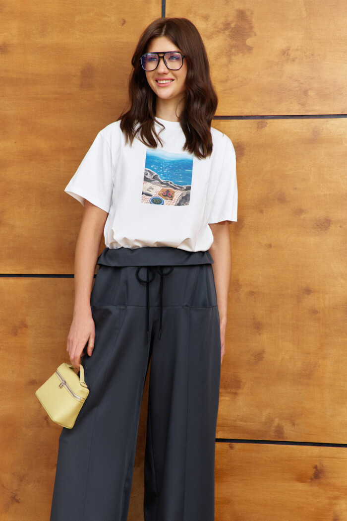 Джемпер выполнен из хлопкового трикотажного полотна высокого качества, обладающего рядом положительных свойств: мягкость, эластичность и устойчивость к деформации. Модель свободного кроя, со спущенной линией плеча и коротким рукавом. Горловина обработана узкой бейкой, а по спинке усилена тесьмой с целью предотвращения ее деформации. Длина по спинке 66 см; длина рукава (от горловины) 39,5 см.