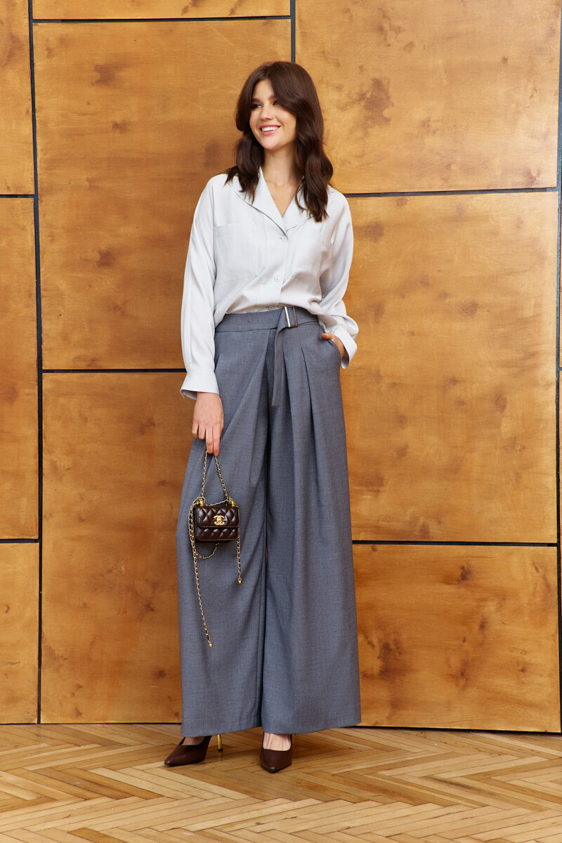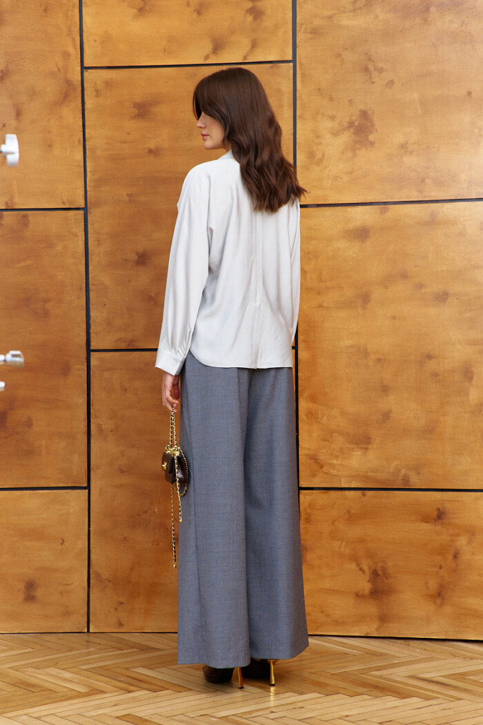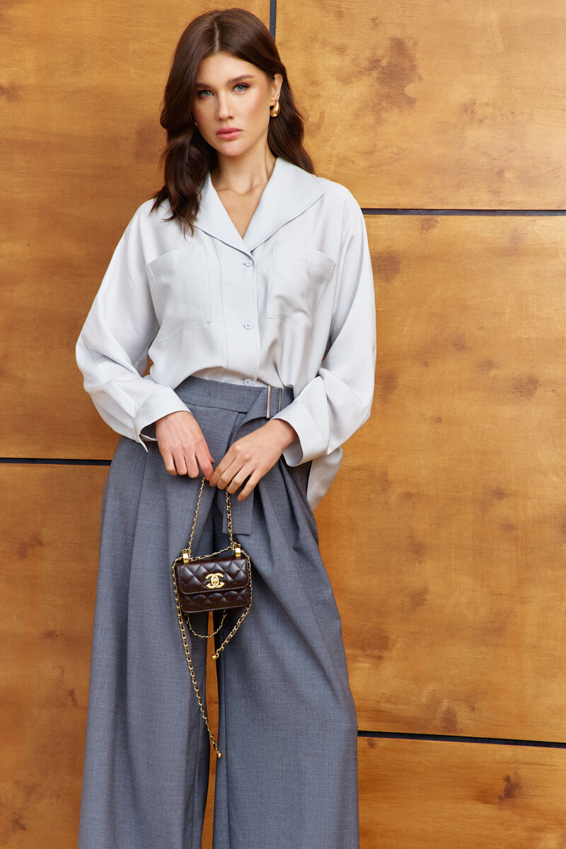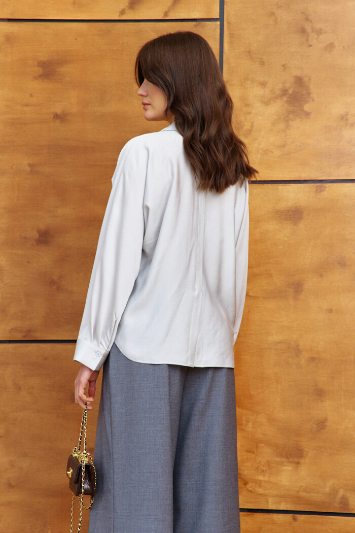 Элегантная блузка в стиле city chic выполнена из платьево-блузочного полотна. Модель прямого силуэта. Воротник отложной фантазийной формы. Спереди предусмотрена застёжка на петли и декоративные пуговицы, и накладные карманы. По спинке оформлена декоративная планка с разрезом по низу. Рукава цельнокроеные длинные со складками вдоль застёгивающейся манжеты. Длина изделия 66 см, длина рукава (от горловины) 70 см.