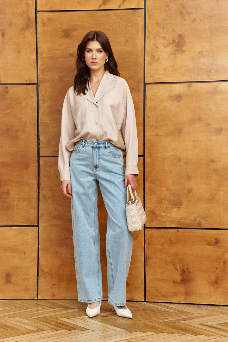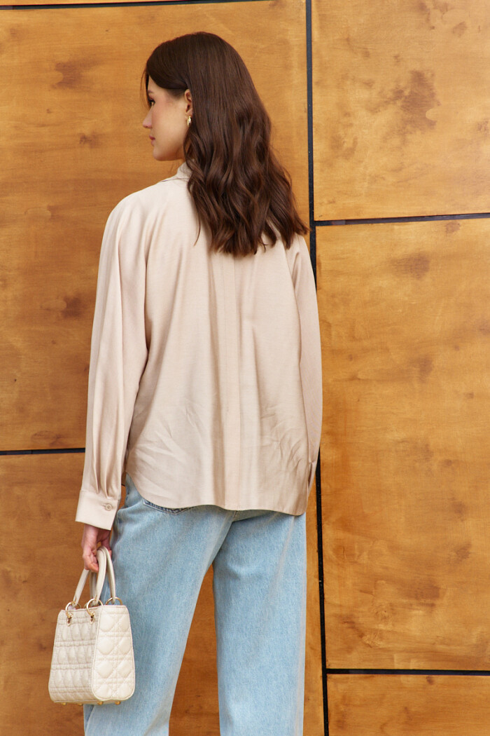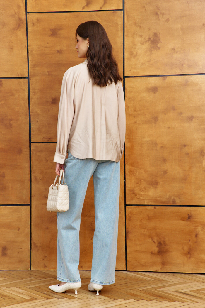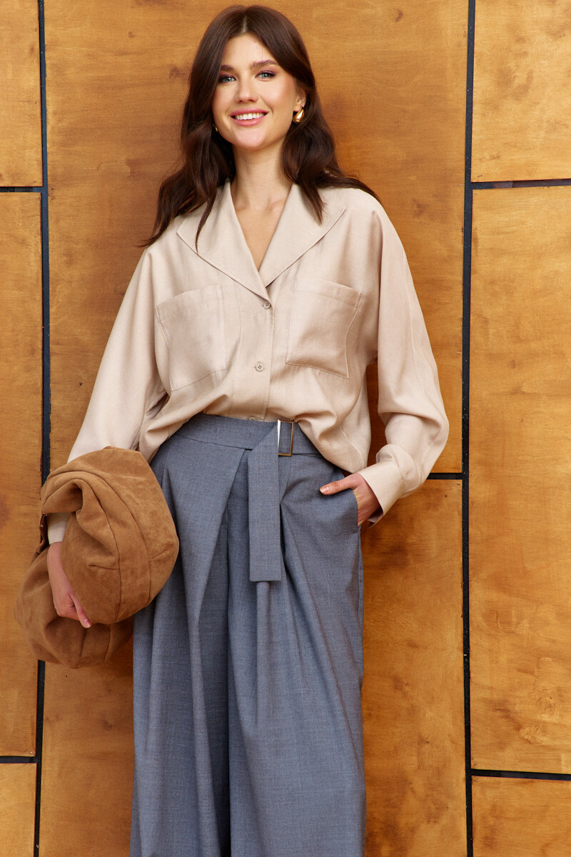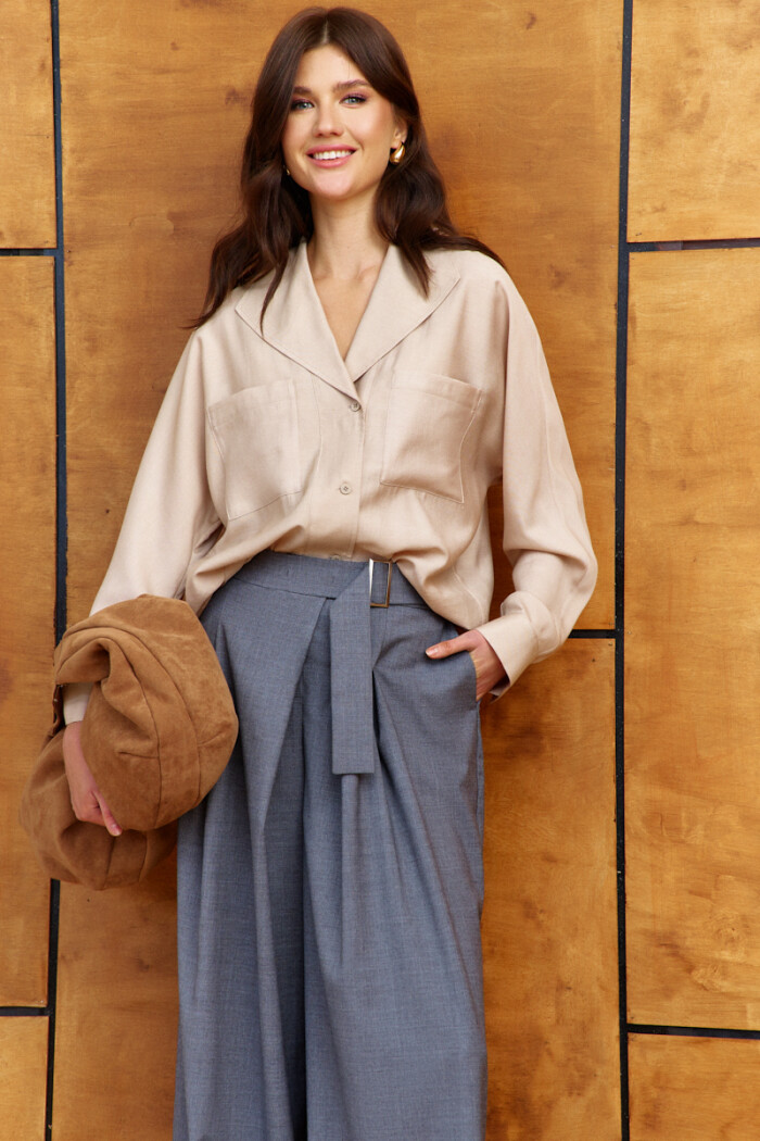 Элегантная блузка в стиле city chic выполнена из платьево-блузочного полотна. Модель прямого силуэта. Воротник отложной фантазийной формы. Спереди предусмотрена застёжка на петли и декоративные пуговицы, и накладные карманы. По спинке оформлена декоративная планка с разрезом по низу. Рукава цельнокроеные длинные со складками вдоль застёгивающейся манжеты. Длина изделия 66 см, длина рукава (от горловины) 70см.