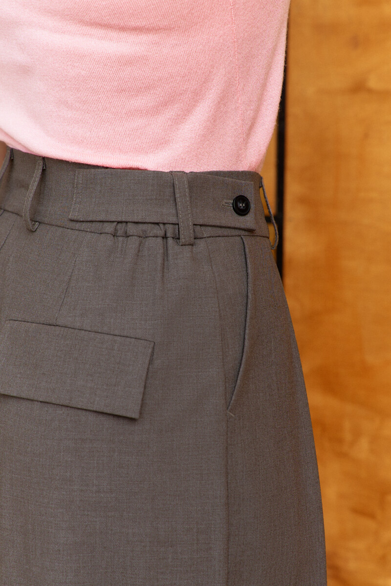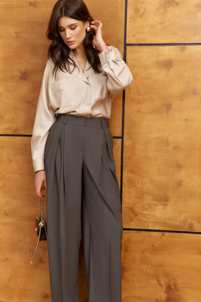 Классические свободные брюки выполнены из костюмного полотна. Модель с комфортной высокой посадкой, с притачным поясом со шлевками и эластичной лентой внутри по спинке, застёгивающейся на два потайных брючных крючка. Спереди заложены встречные складки, обработаны карманы отрезным бочком. Для удобства в носке спереди предусмотрена застёжка на тесьму «молния». Особым декоративным элементом являются настрочные паты на поясе, переходящие со спинки на перед, которые фиксируются на петлю и декоративную пуговицу, а по спинке — прорезной карман с клапаном. Длина изделия по боковому шву (с поясом) 110 см.