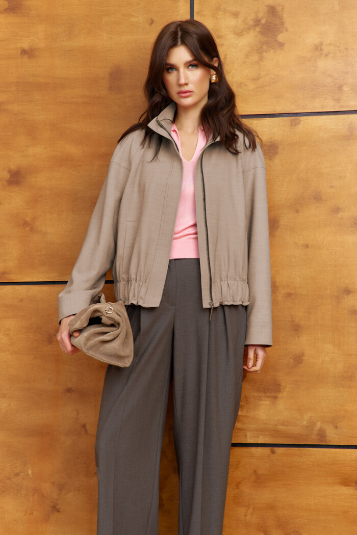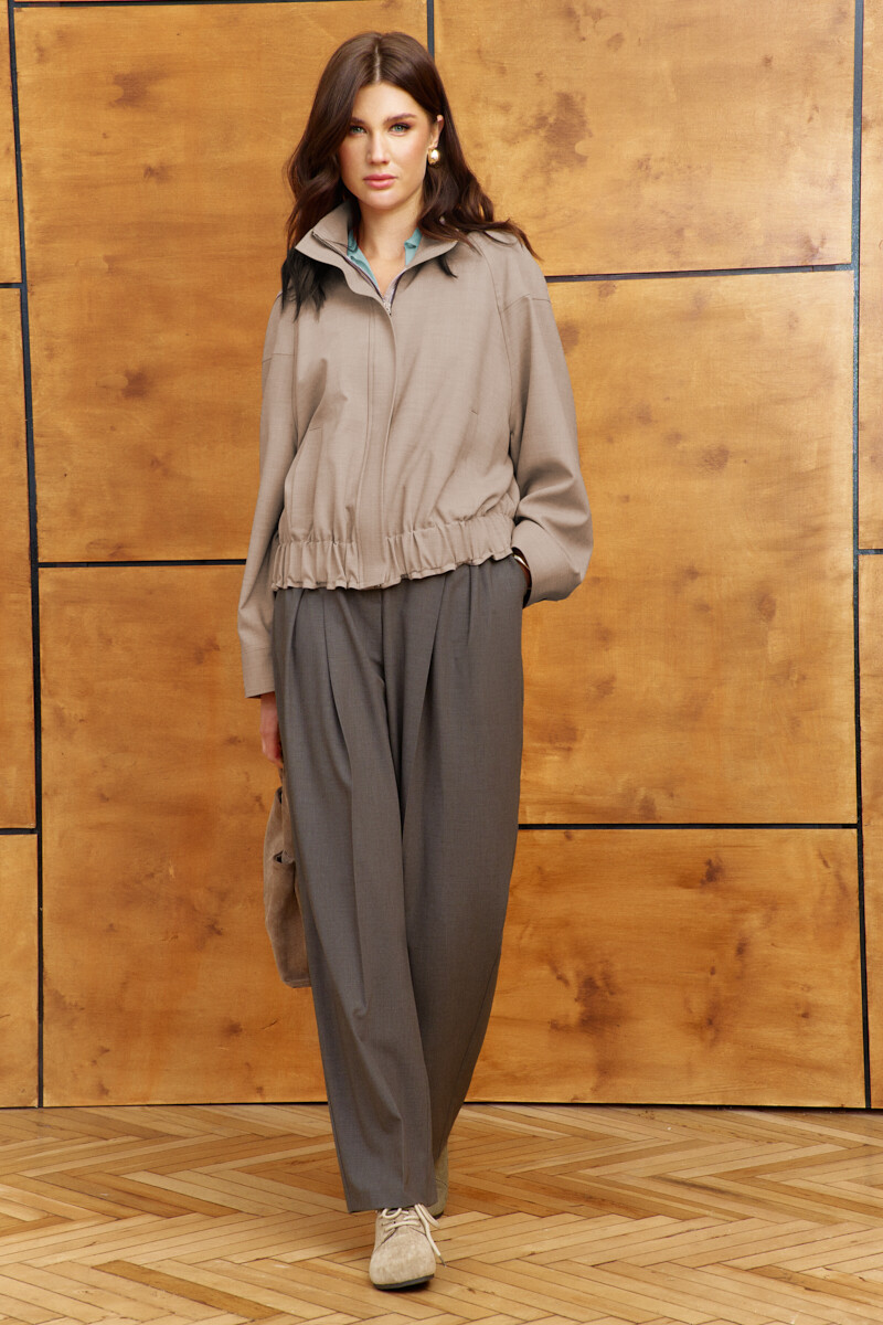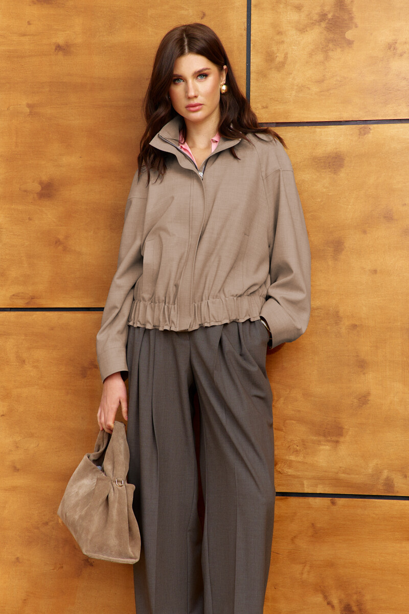 Стильный и практичный жакет на подкладке выполнен из костюмного полотна. Модель О-образного силуэта с широкой эластичной тесьмой по низу изделия. Воротник-стойка, центральная застёжка на металлическую тесьму "молнию" с декоративной планкой. Для удобства в носке спереди предусмотрены прорезные карманы с широкой листочкой. Длинные втачные рукава реглан с кокеткой по верху и застегивающейся манжетой на петлю и декоративную пуговицу. Длина изделия 53 см; длина рукава (от горловины) 77 см.