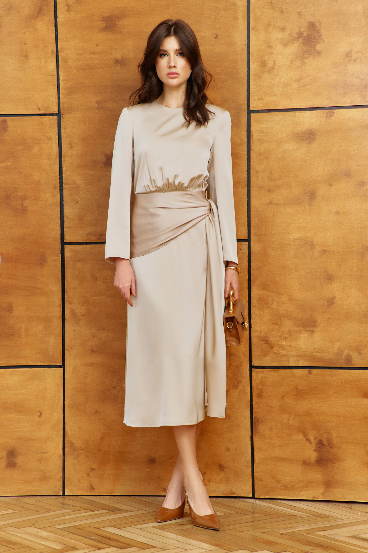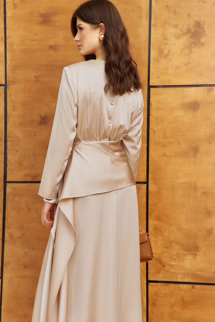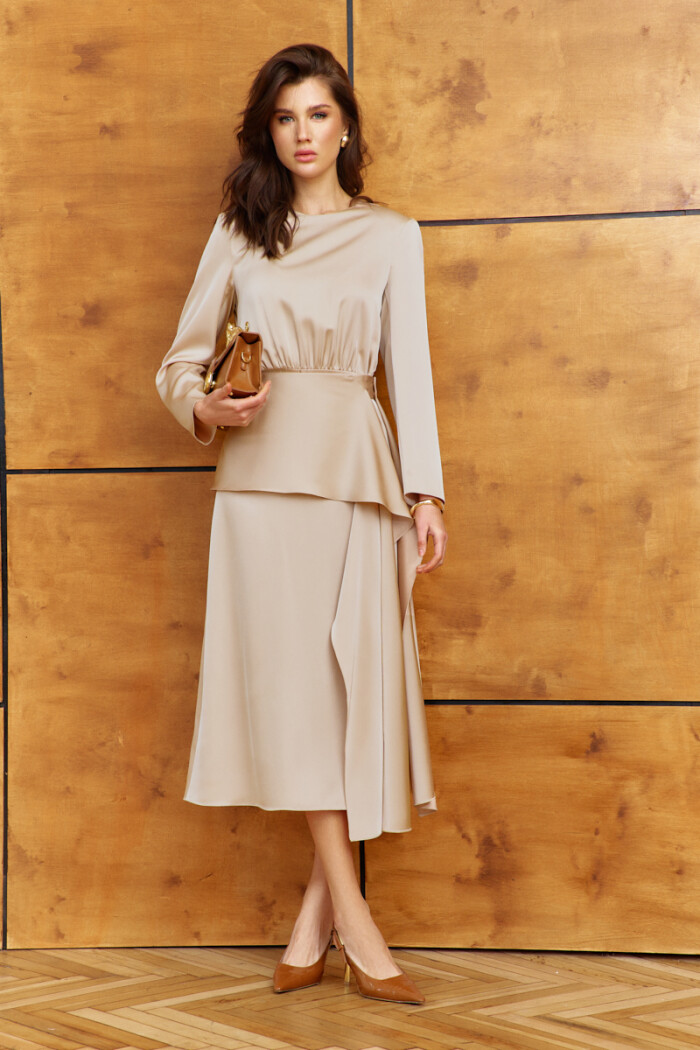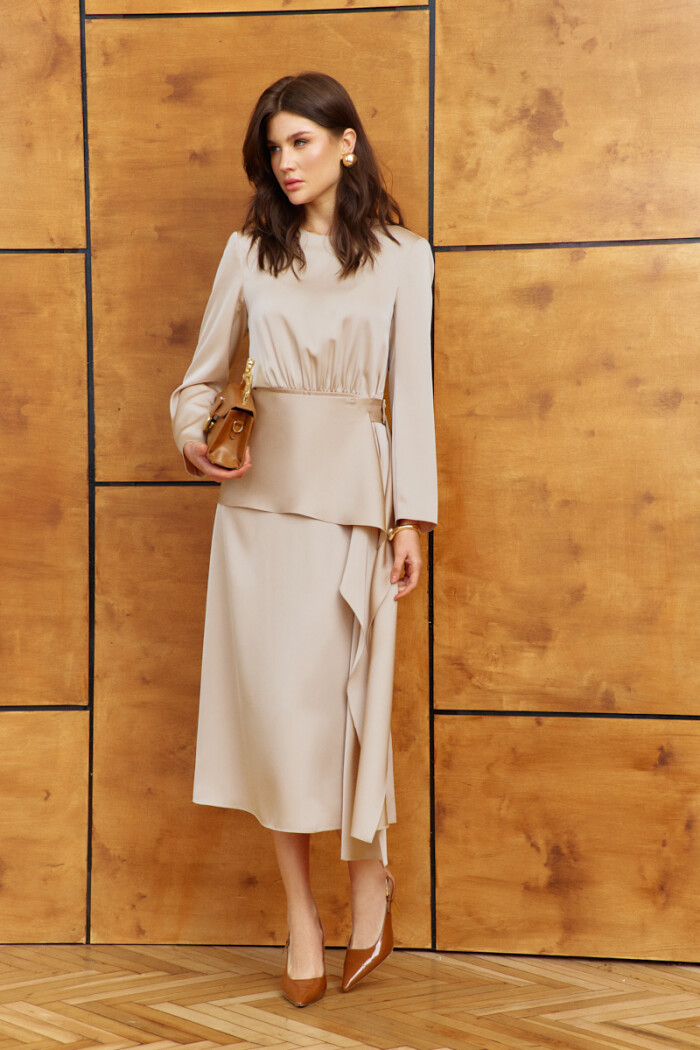 Женственное платье в стиле city chic выполнено из струящегося полотна с благородным блеском. Модель полуприлегающего силуэта, отрезная по линии талии. Горловина круглой формы. Лиф переда и спинки со сборкой по середине нижнего среза. В среднем шве спинке лифа выполнена застёжка на петли и декоративные пуговицы. Для удобства в носке в среднем шве спинки юбки выполнена застёжка на потайную "тесьму-молнию". Особым декоративным элементом съемный пояс с баской из основного полотна, застёгивающийся на две прорезных петли и пришивных пуговицы. Рукава длинные втачные. Длина изделия 124 см, длина рукава 59 см.