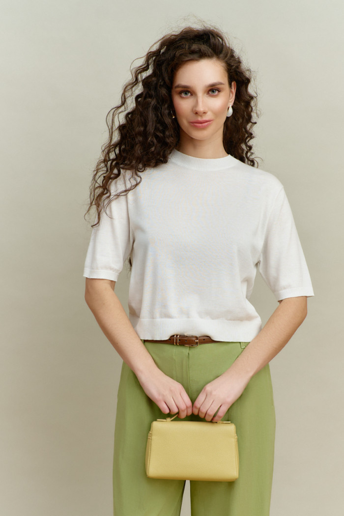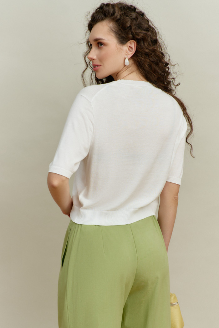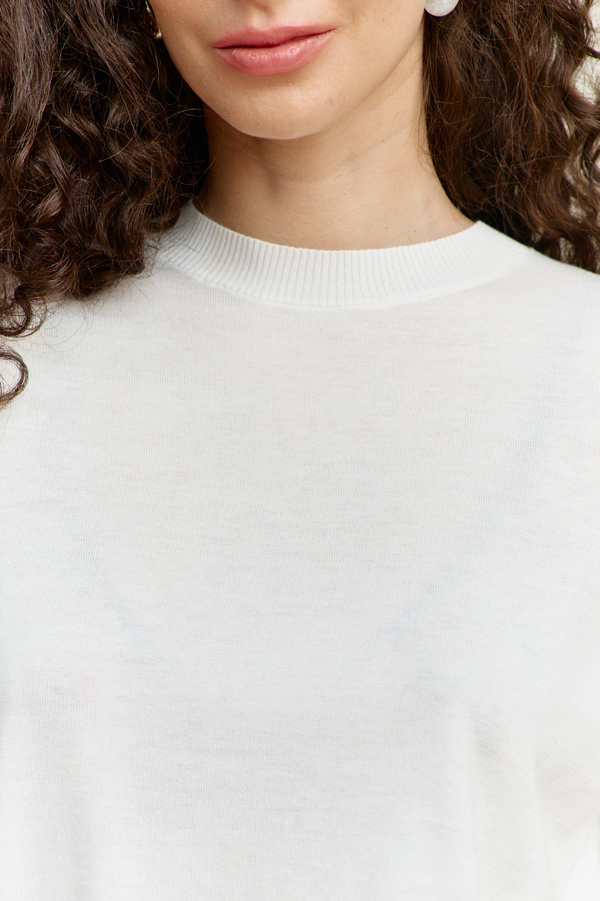 Джемпер вязаный полуприлегающего силуэта вязки "лицевая гладь". Модель длиной выше линии бедер. Круглый вырез горловины. Укороченный рукав. Низ изделия и рукава оформлен манжетой. Базовая модель, подойдет к любому типу гардероба. Длина изделия 53 см; длина рукава 26 см.